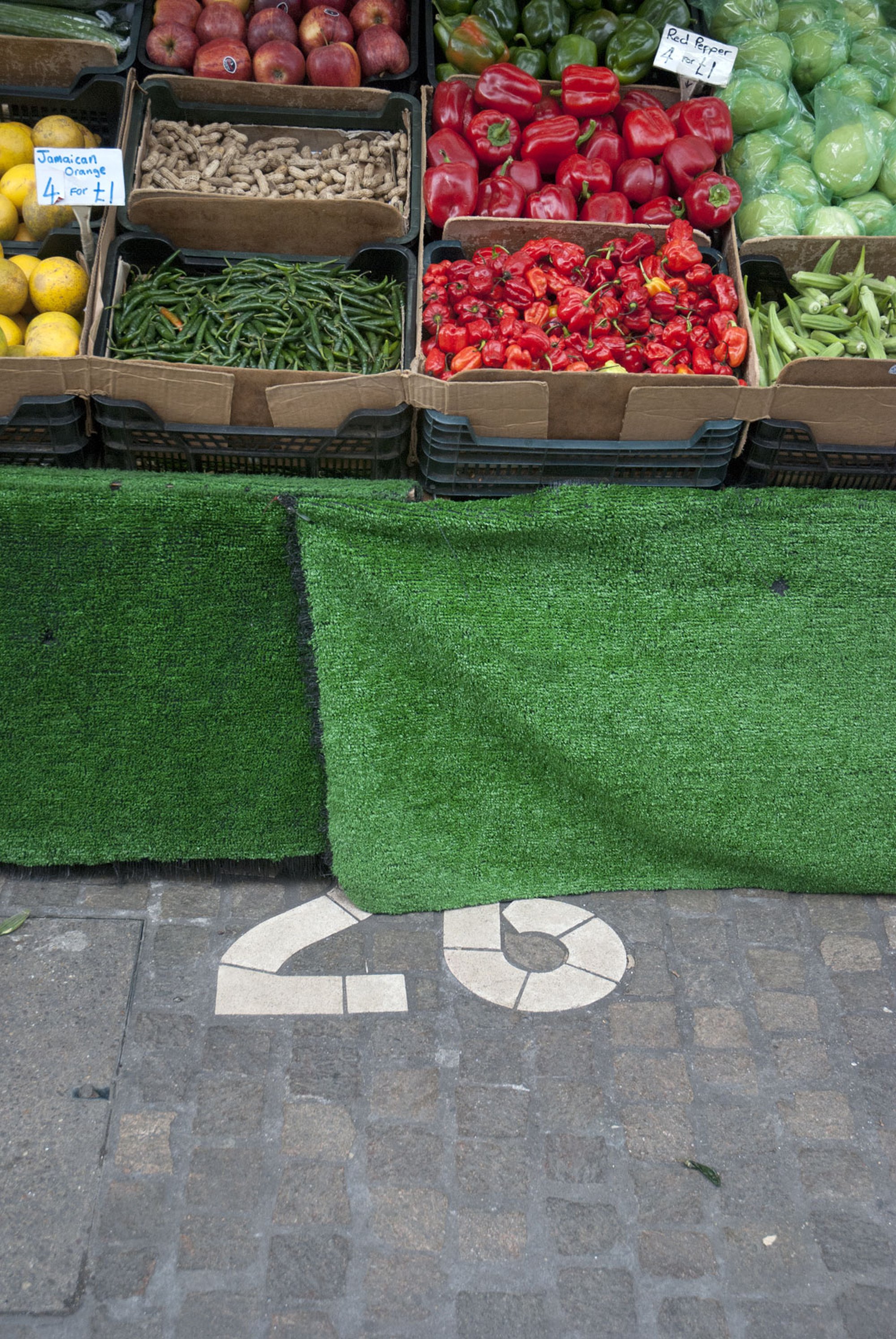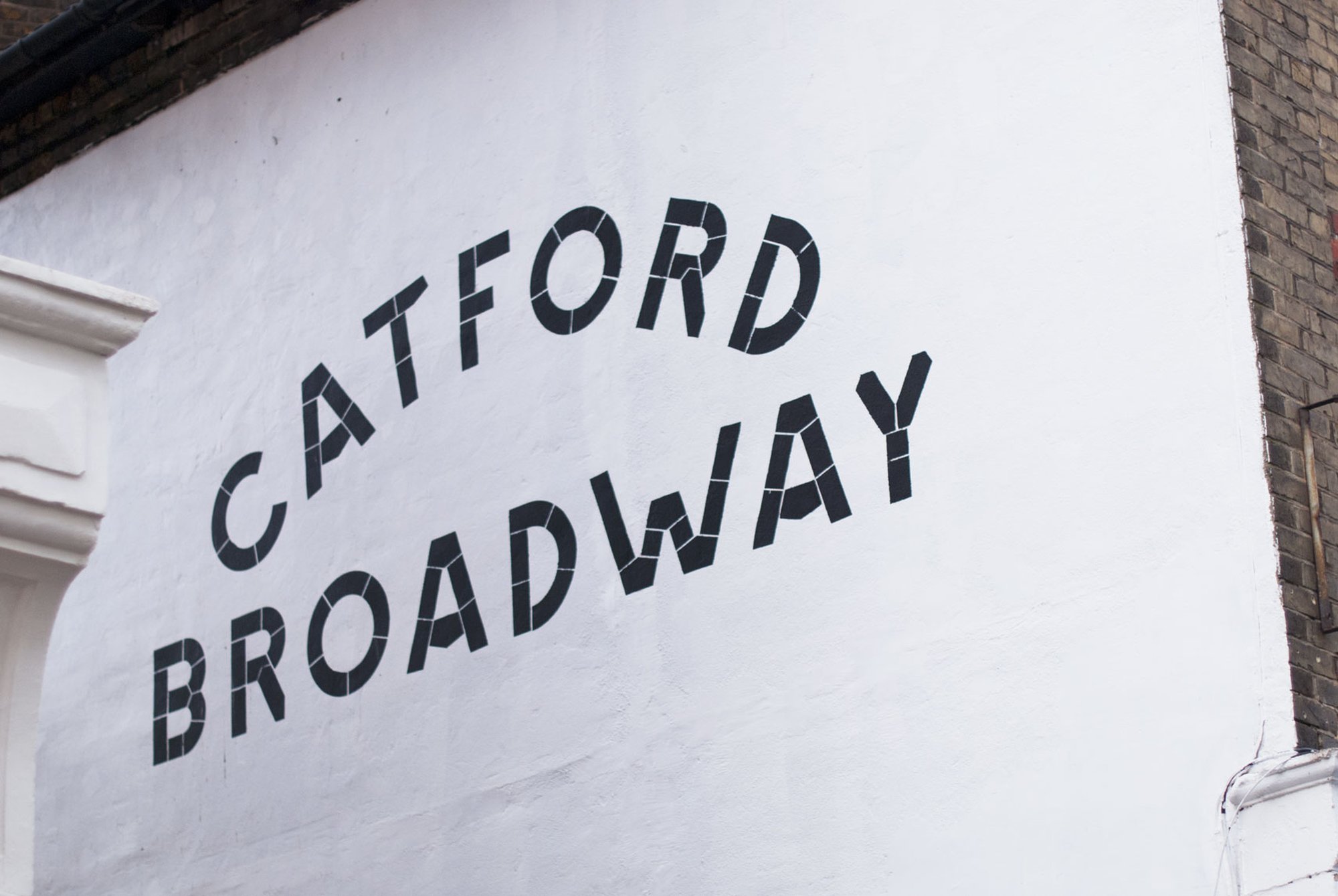 Im Rahmen eines Programms zur Umgestaltung des öffentlichen Raums bestand diese Arbeit darin eine für Catford Broadway – eine lokale High Street im Süden Londons in der auch ein Wochenmarkt stattfindet – zugeschnittene Typografie zu entwickeln, die sowohl für Signaletik als auch für Drucksachen verwendet werden kann. Wir ließen uns wörtlich von der Straße inspirieren, und entwarfen eine Schrifttype, die auf 12 geometrischen Elementen basiert welche in das existierende Porphyr-Pflaster eingepasst werden kann. Die per Wasserjet geschnittenen Granitsteine wurden so buchstäblich im Ort verankert und verleihen der Straße eine subtile, aber dauerhafte Identität. Zusätzlich wurde die Typo jeweils am Straßenende auf zwei Hauswänden angebracht.