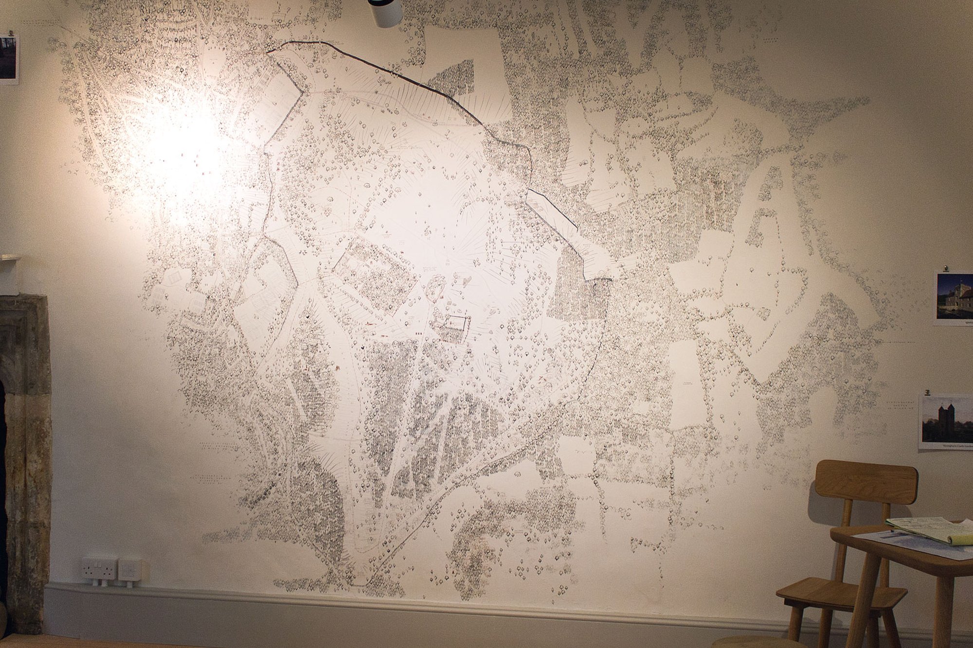 Alle Texttafeln lehnen auf einem schmalen, der Wand vorgelagertem Regal das sich um den gesamten Raum herum erstreckt. Darüber hinaus wurde eine großformatige, detaillierte, handgezeichnete Karte, die alle historischen Schichten und Kuriositäten zeigt, von uns entworfen und künstlerisch gestaltet.