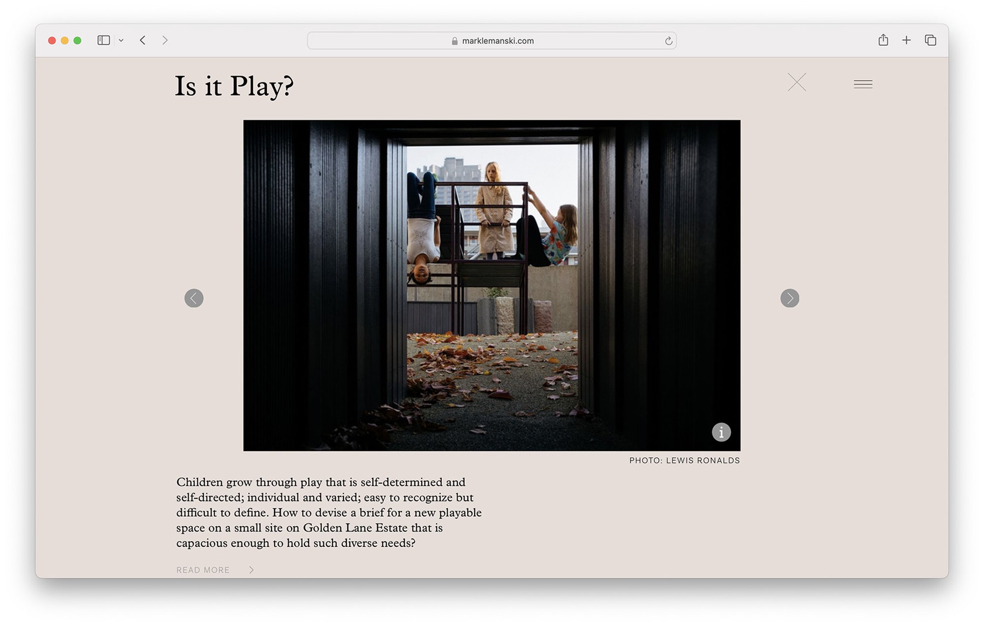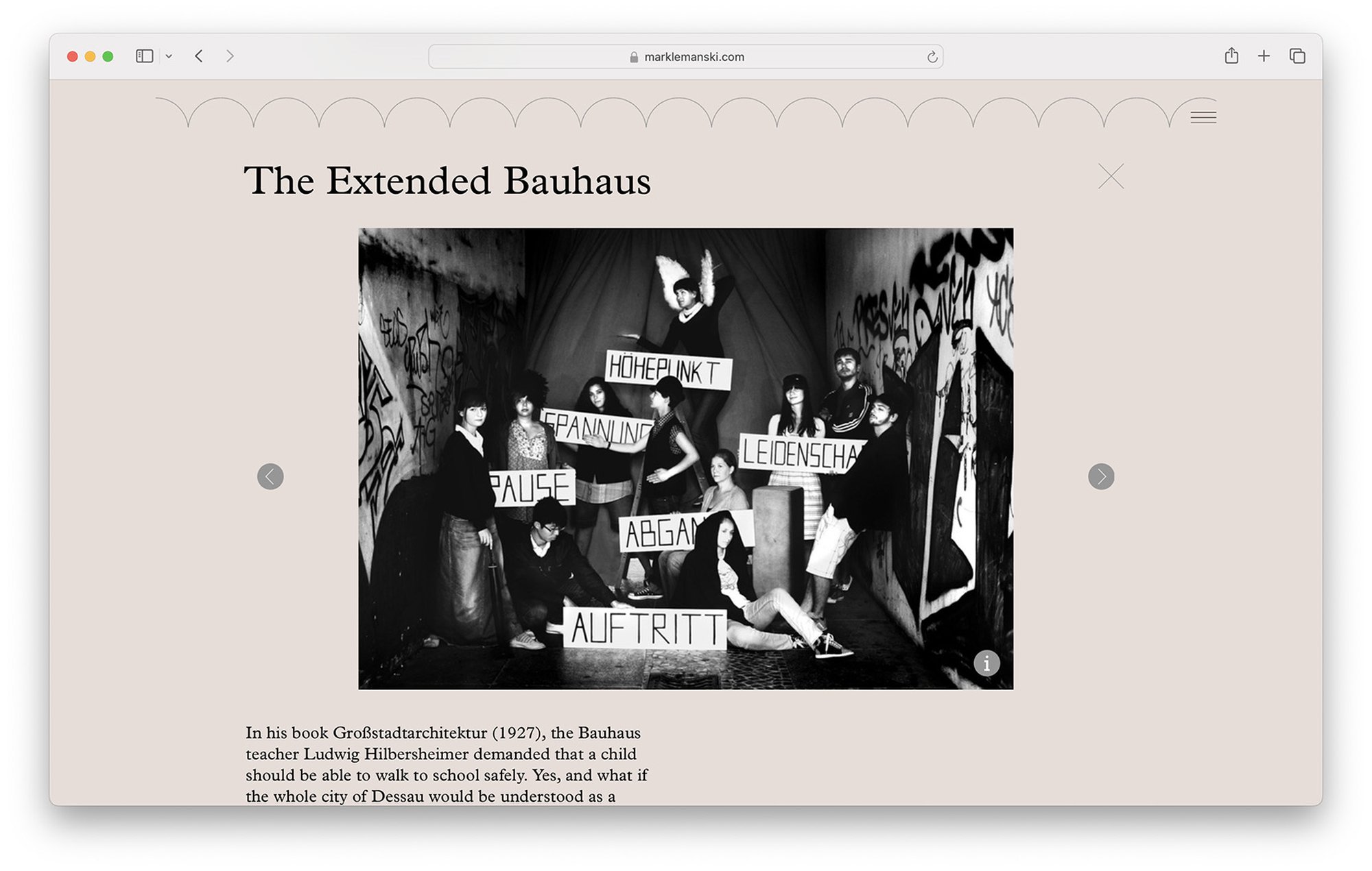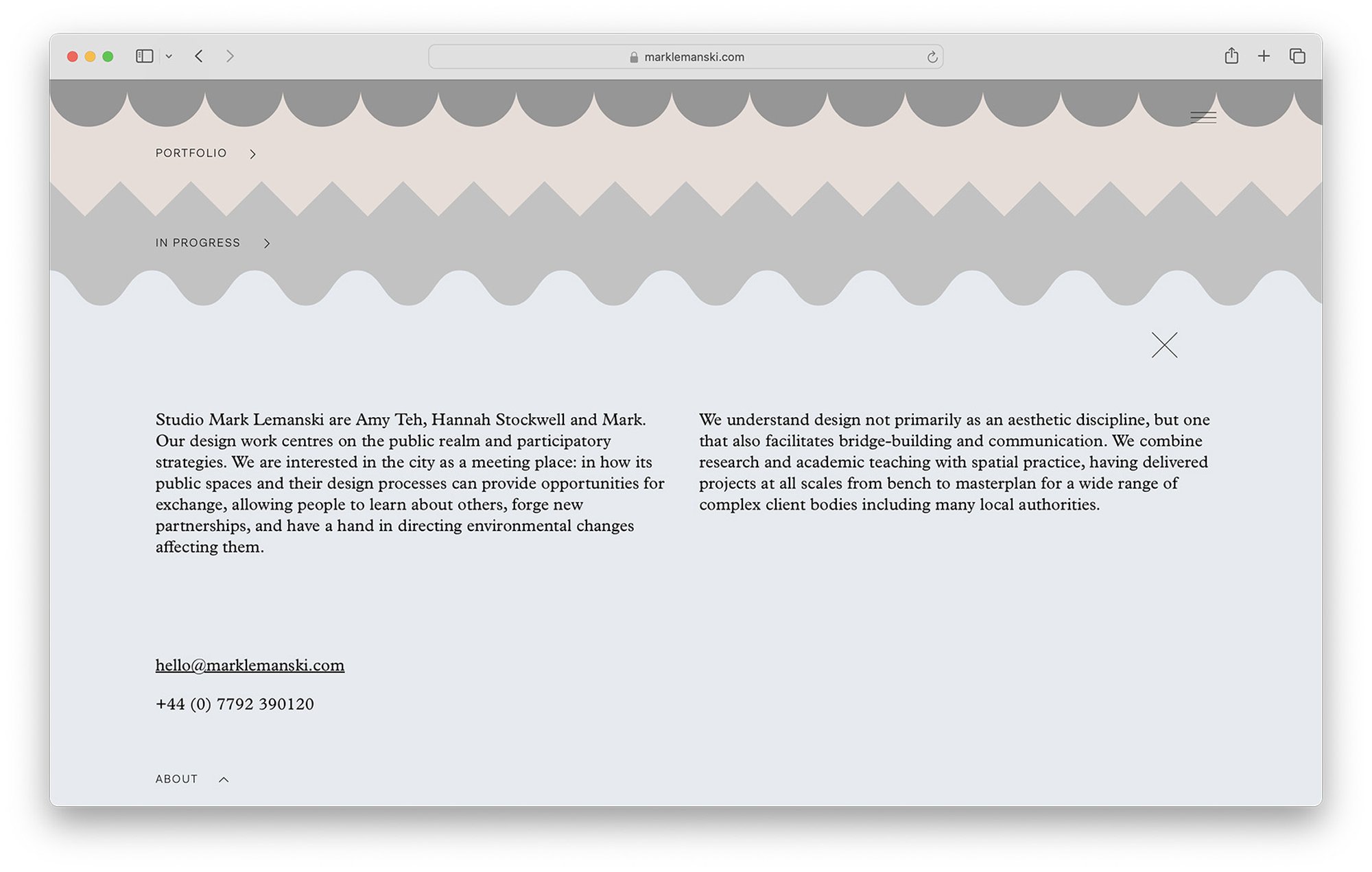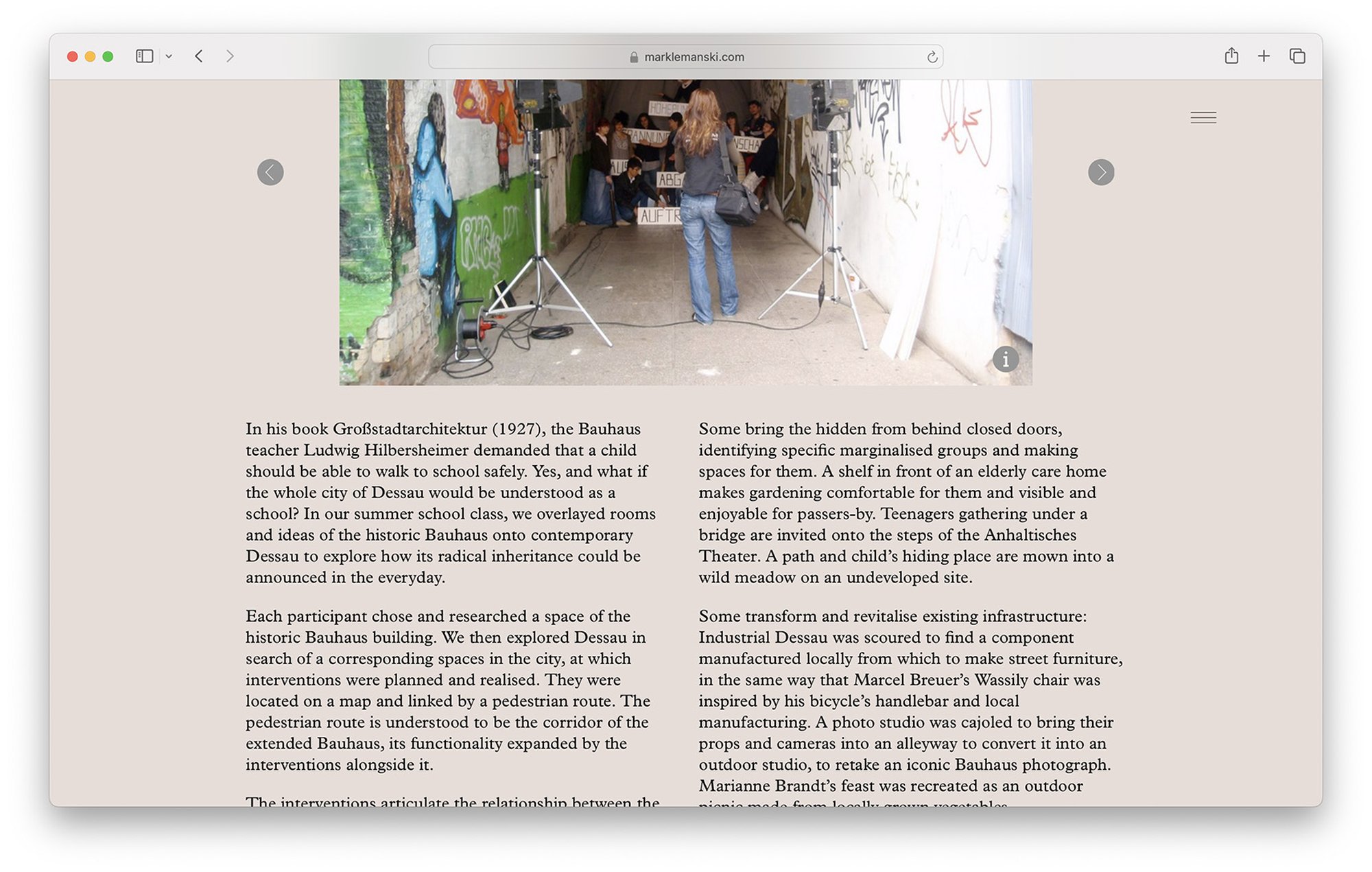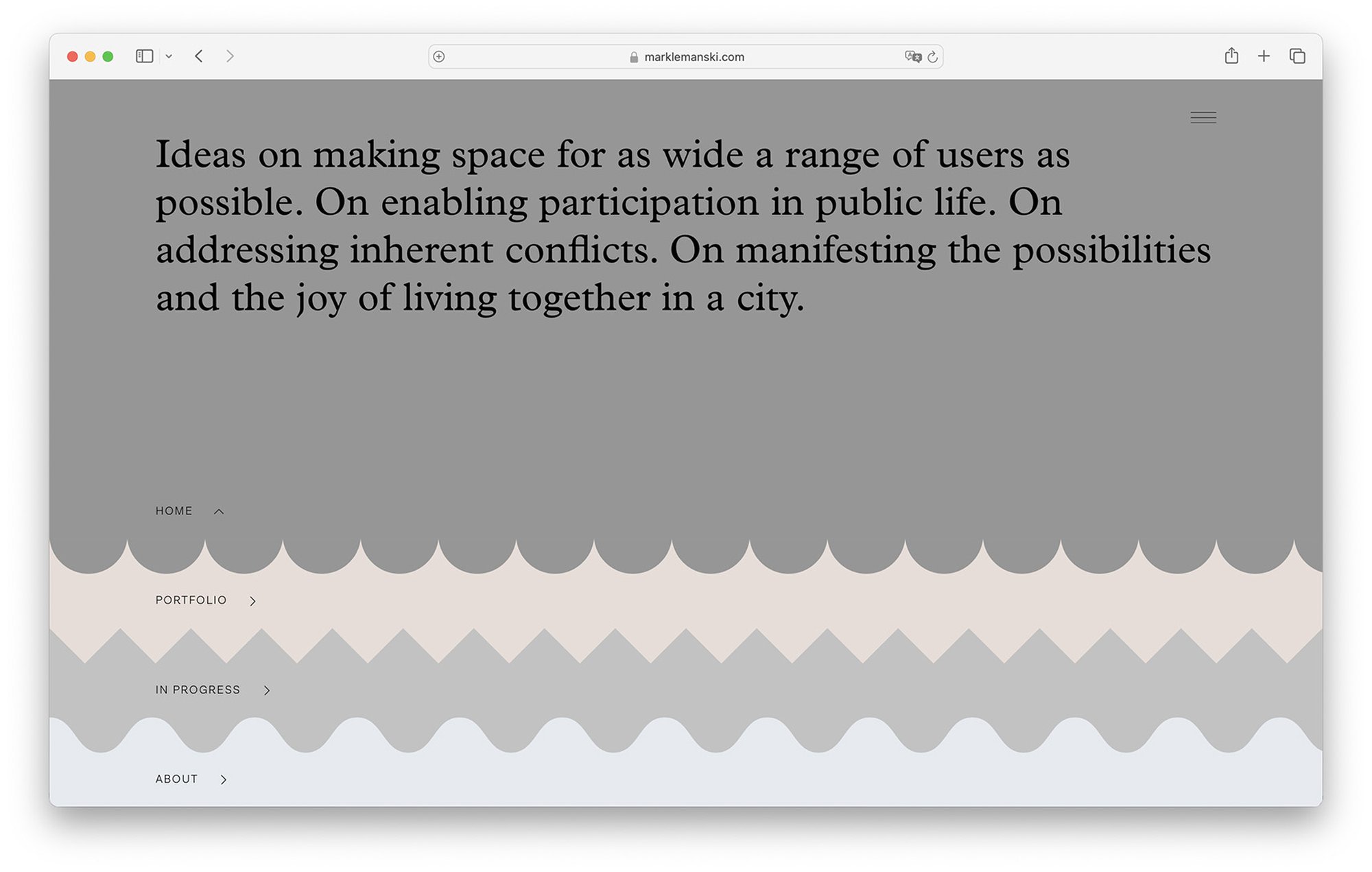 Der Internetauftritt des Urbanisten Mark Lemanski gliedert sich in vier Abschnitte: Einleitung, Portfolio, Instagram Plug-in, und ein Studio Porträt. Die sich mit den Jahreszeitenden wechselnden Hintergrundfarben (hier unten die Winter-Palette) spiegeln die urbane Stimmung wider. Die Portfoliofunktion bietet zwei Informationsebenen für jedes Projekt, eine Übersicht, sowie eine detaillierte Beschreibung jeder Abbildung.