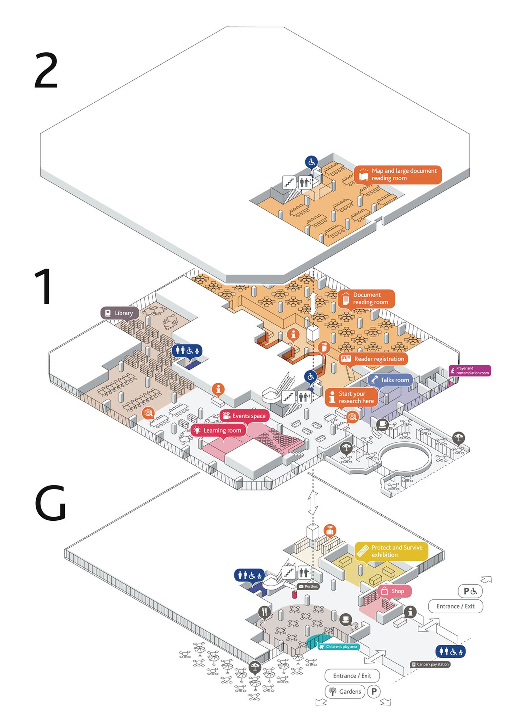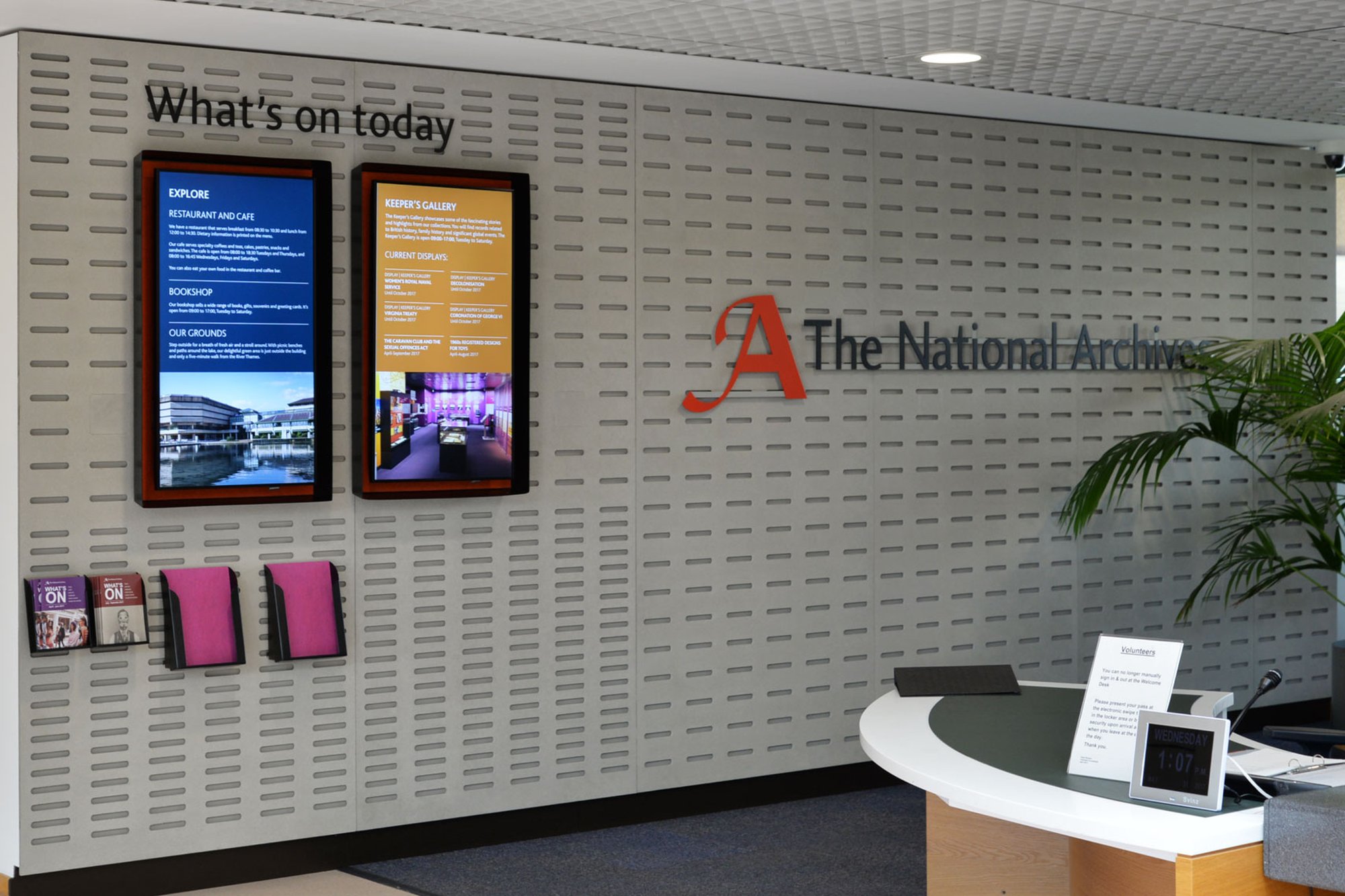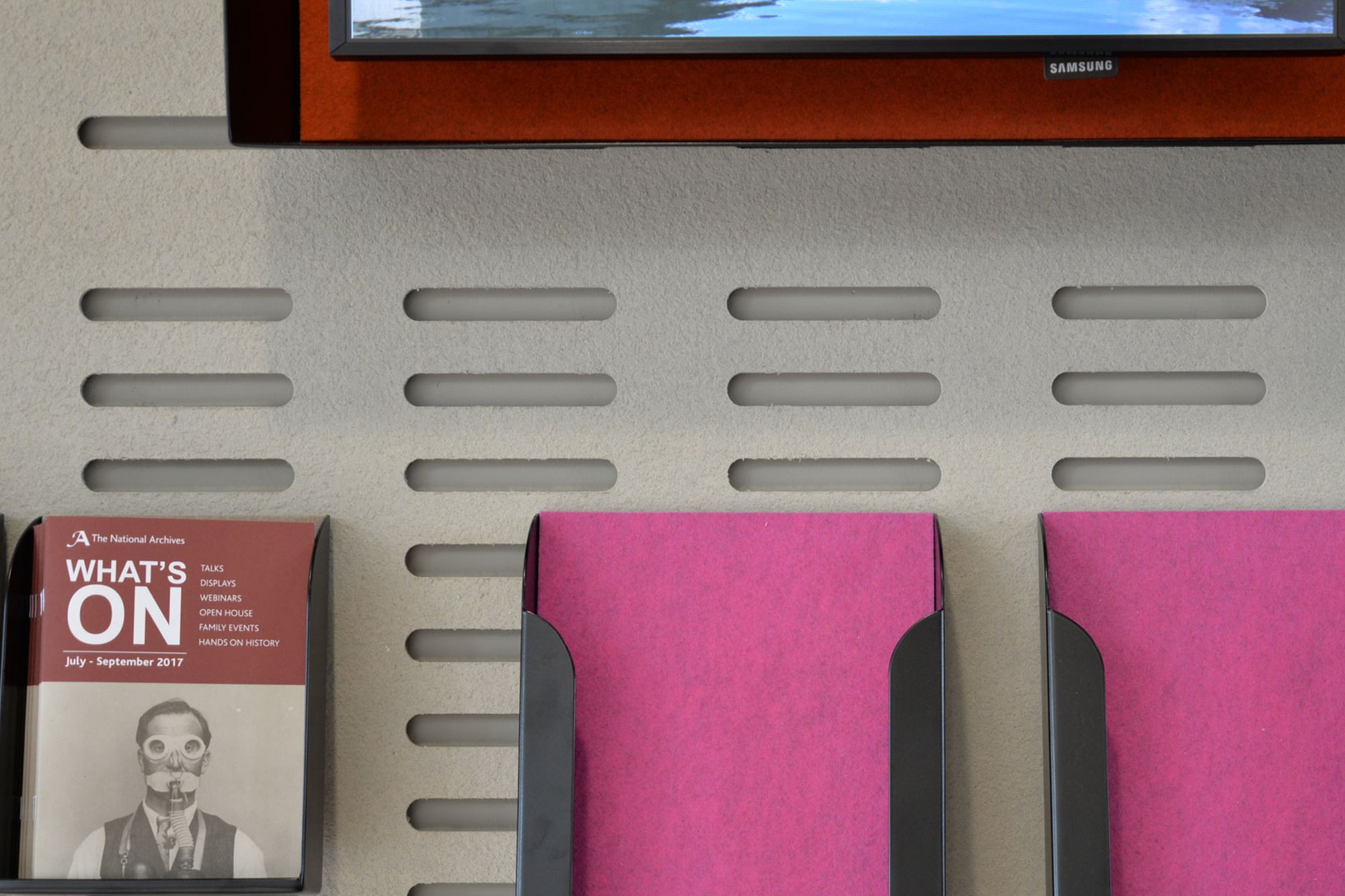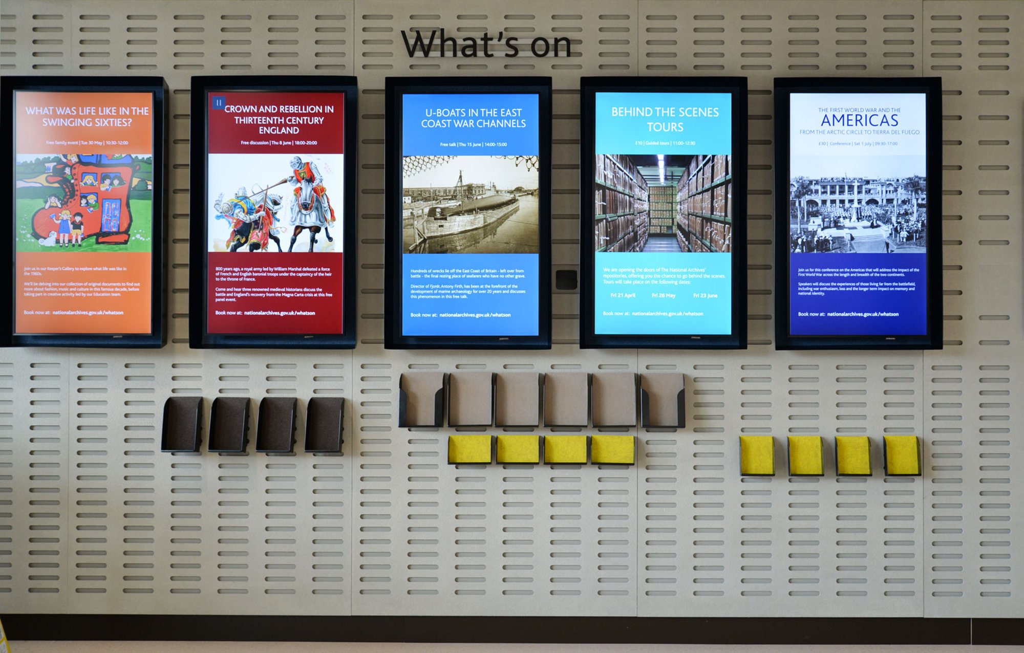 Als Teil des Design-Teams für die Neugestaltung der öffentlichen Räume des britischen National Archive, waren wir verantwortlich für die Informations-Wand im Foyer des Archivs. Diese sollte dem Archiv ermöglichen dessen vielfältiges Veranstaltungsprogramm mittels Broschüren, Flyern sowie digital sichtbar zu machen.