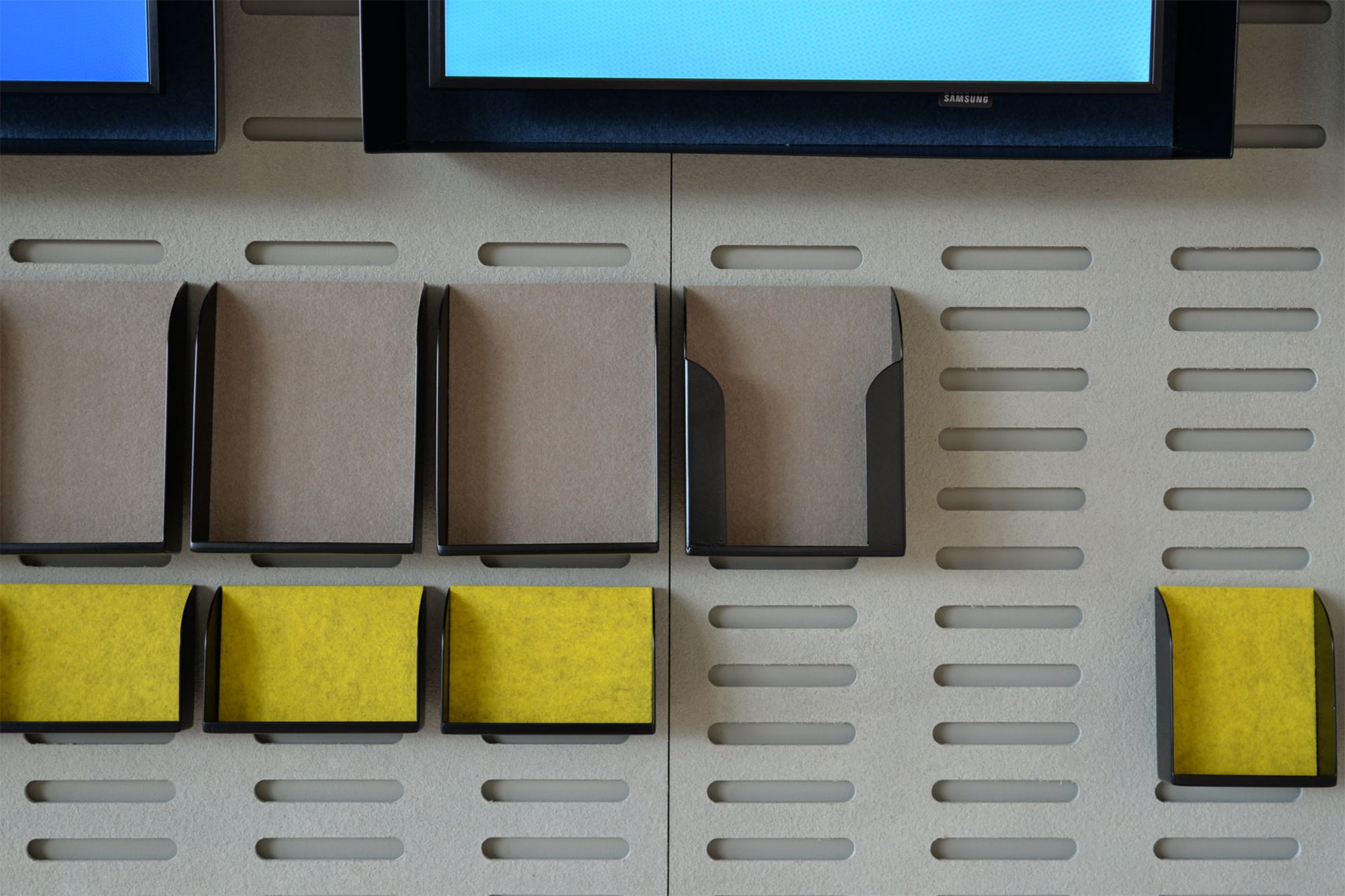 Unsere Designlösung bestand in einer genuteten Zementboardwand, welche den Sichtbeton des ikonischen modernistischen Gebäudes materiell aufgreift. In dieses Nut-Raster können Aluminumdisplays verschiedener Formate frei arrangiert werden, als auch fünf großformatige Bildschirme.