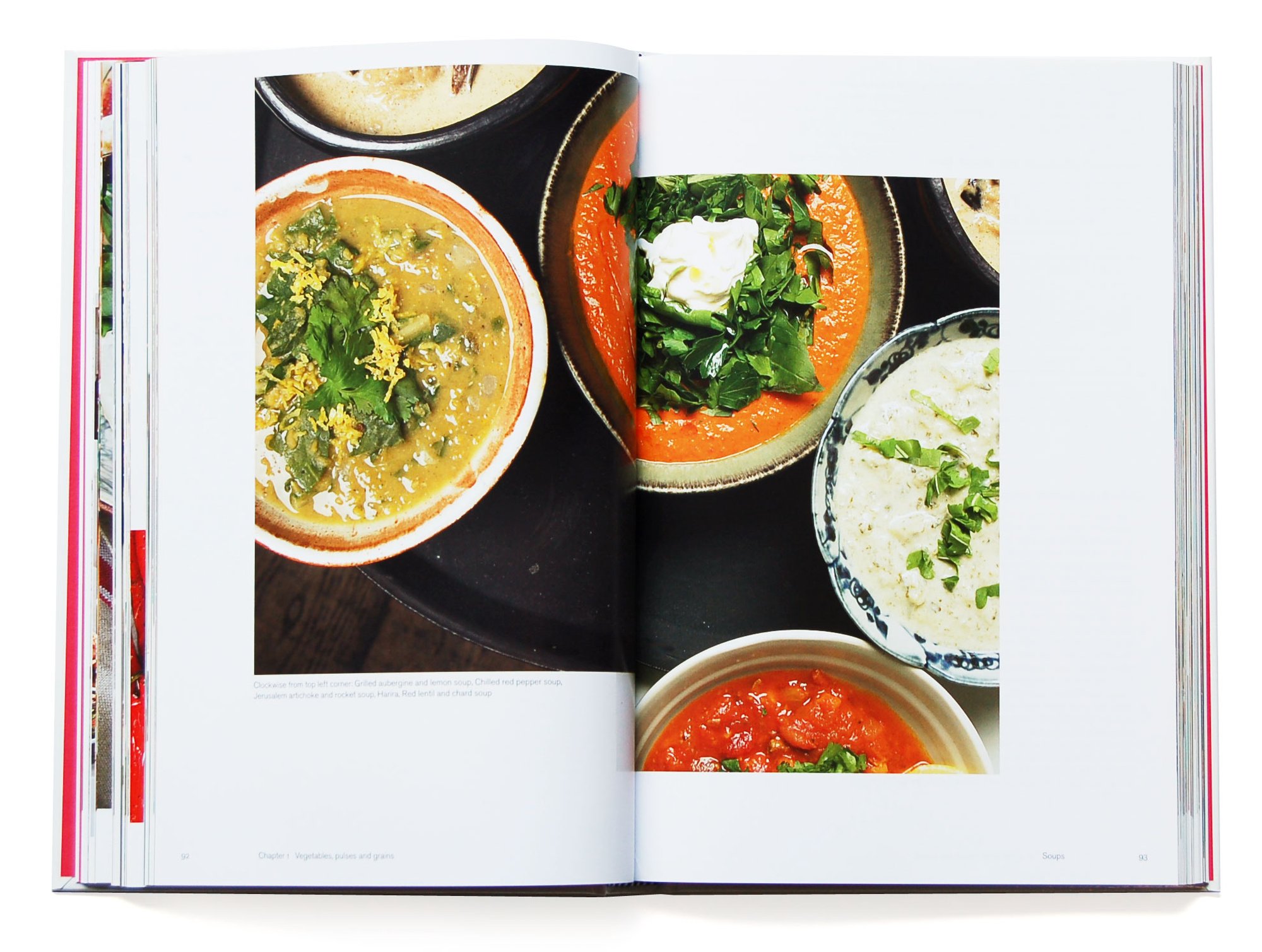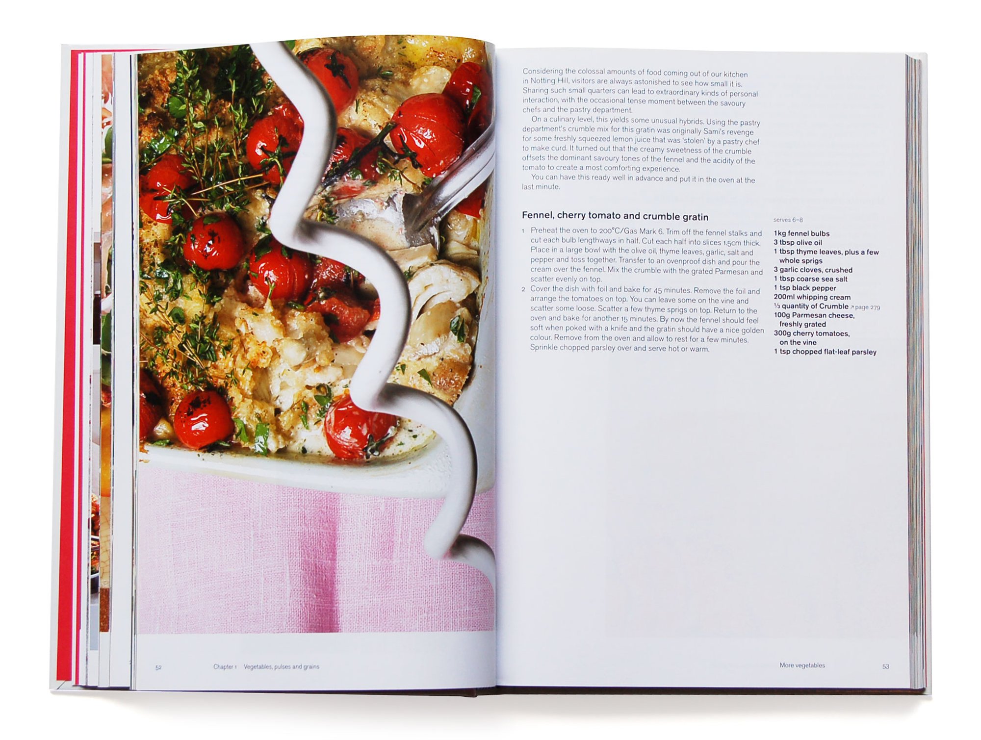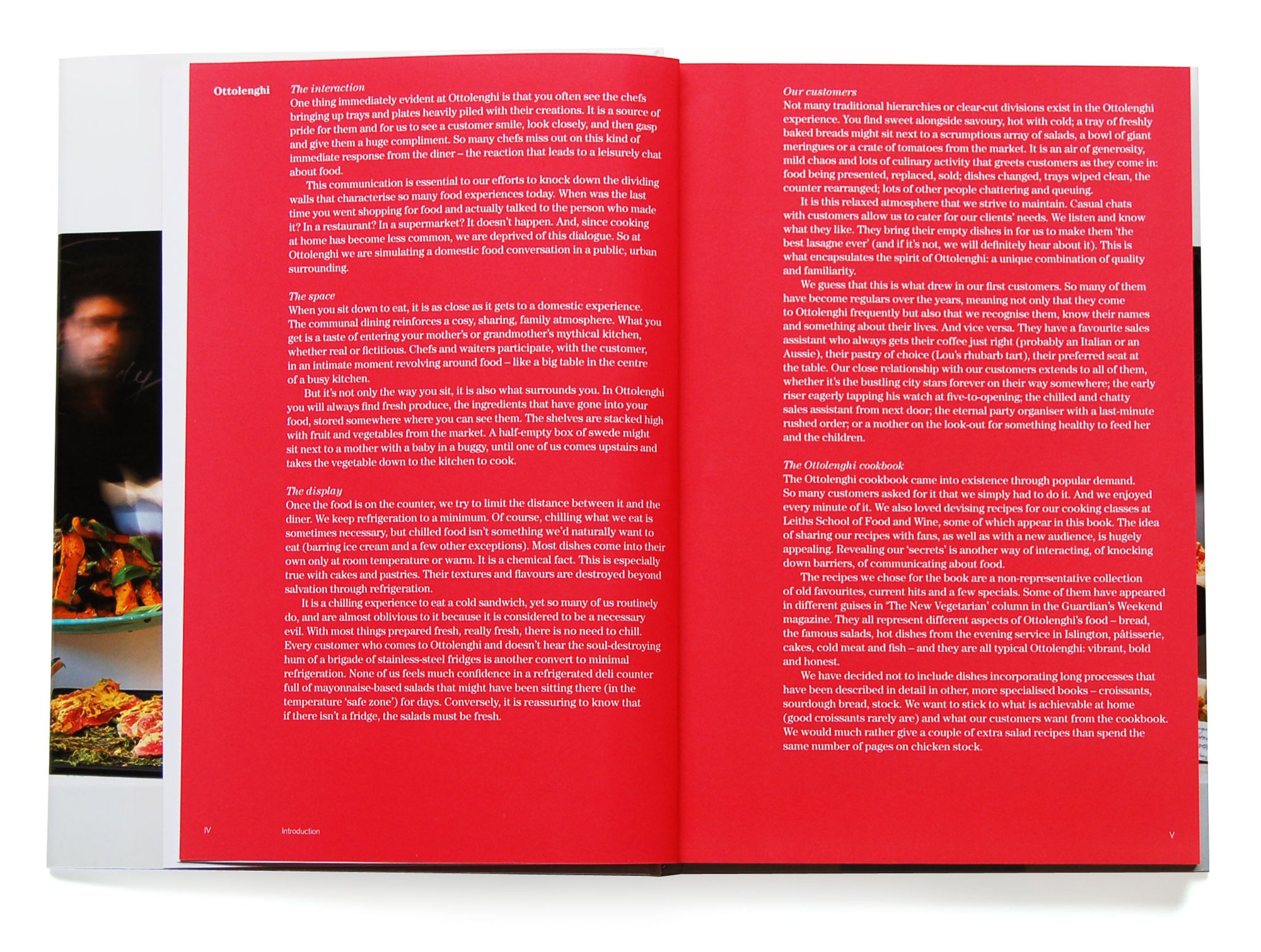 Unsere künstlerische Leitung hat alles was gestellt oder arrangiert wirkt rigoros ausgeschlossen. Alle Gerichte wurden am Tag des Aufahmen von Ottolenghi-Köchen zubereitet und vor Ort in den vier Londoner Ottolenghi-Restaurants und -Küchen aufgenommen. Durch das gesamte Buch hinweg hält der Fotograf Richard Learoyd seinen dokumentarischen Stil bei und vermeidet aufwendige Kompositionen. Unser Layout komplementiert die Fotografie mit einem klaren Satz und strenger typografischer Hierarchie.
