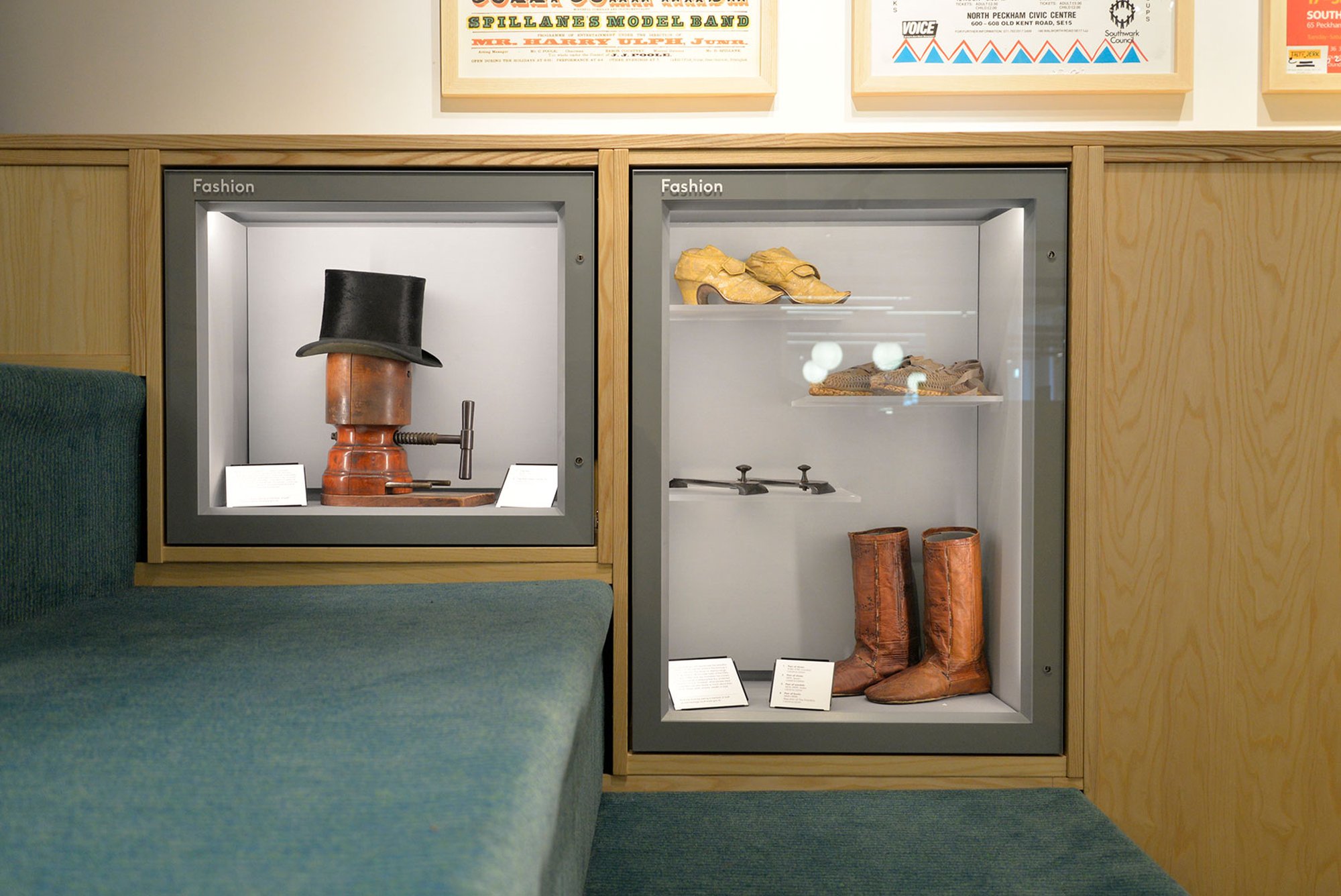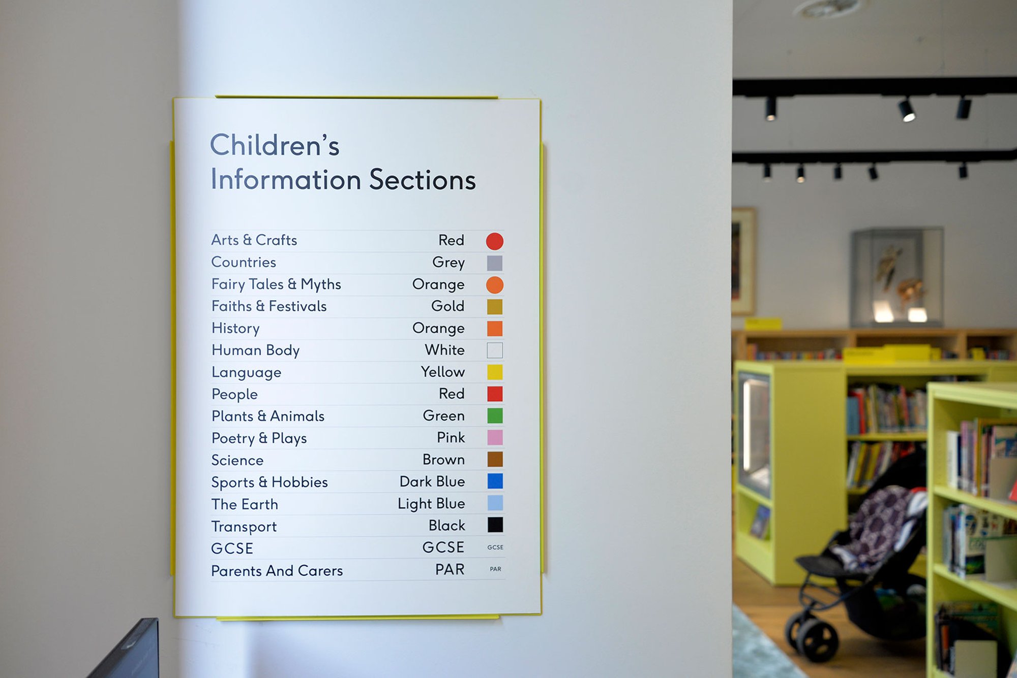 Die gestalterische Herausforderung lag hierbei darin ein intuitives Orientierungssystem zu schaffen, was gleichzeitig die Zusammenhänge zwischen der Büchersammlung und den ausgestellten Objekten aus Southwark’s Cuming Collection herstellt. Zusätzlich wurde ein Bereich räumlich und farblich ausgegliedert, welcher die Stadtentwicklung von Southwark dokumentiert.