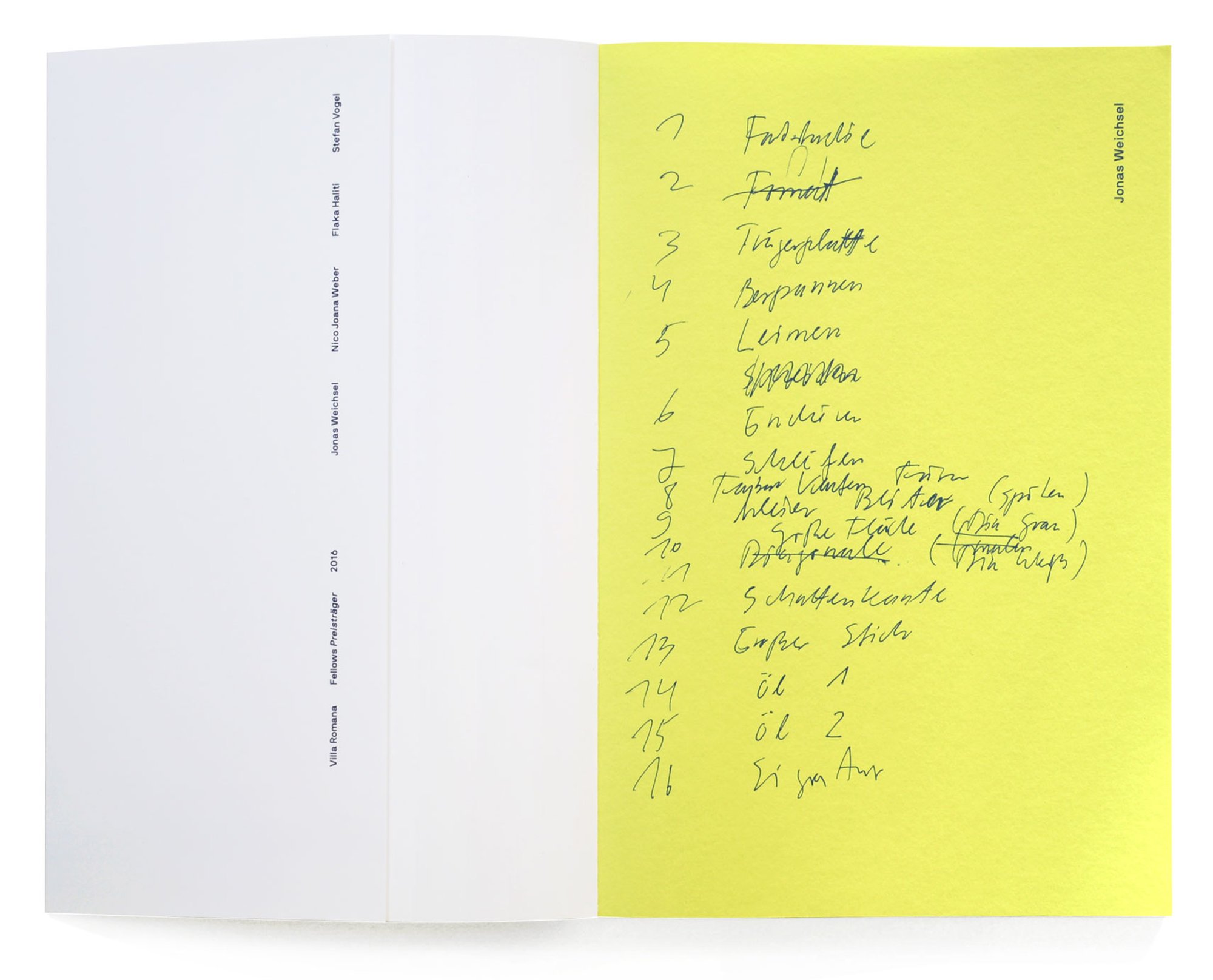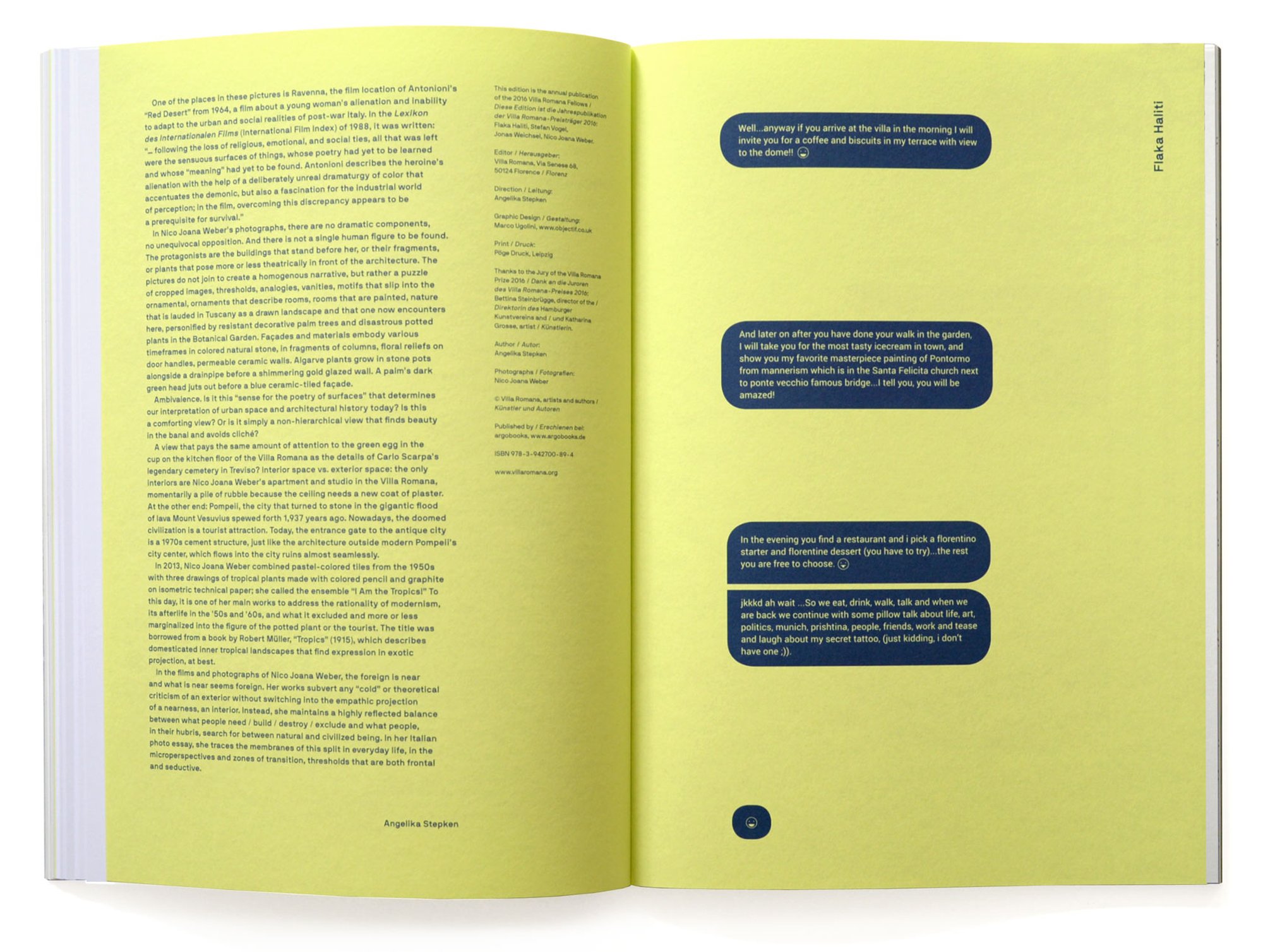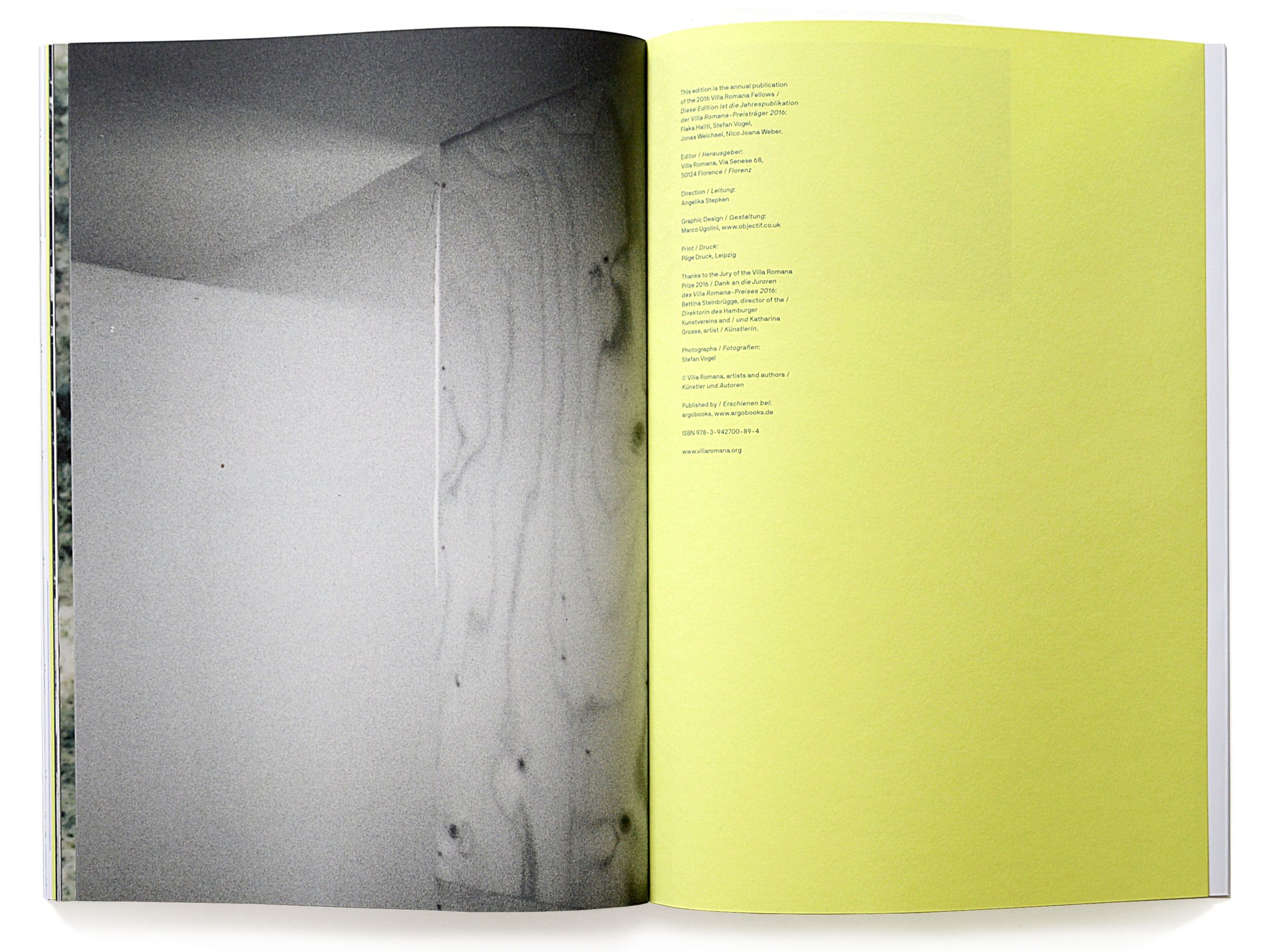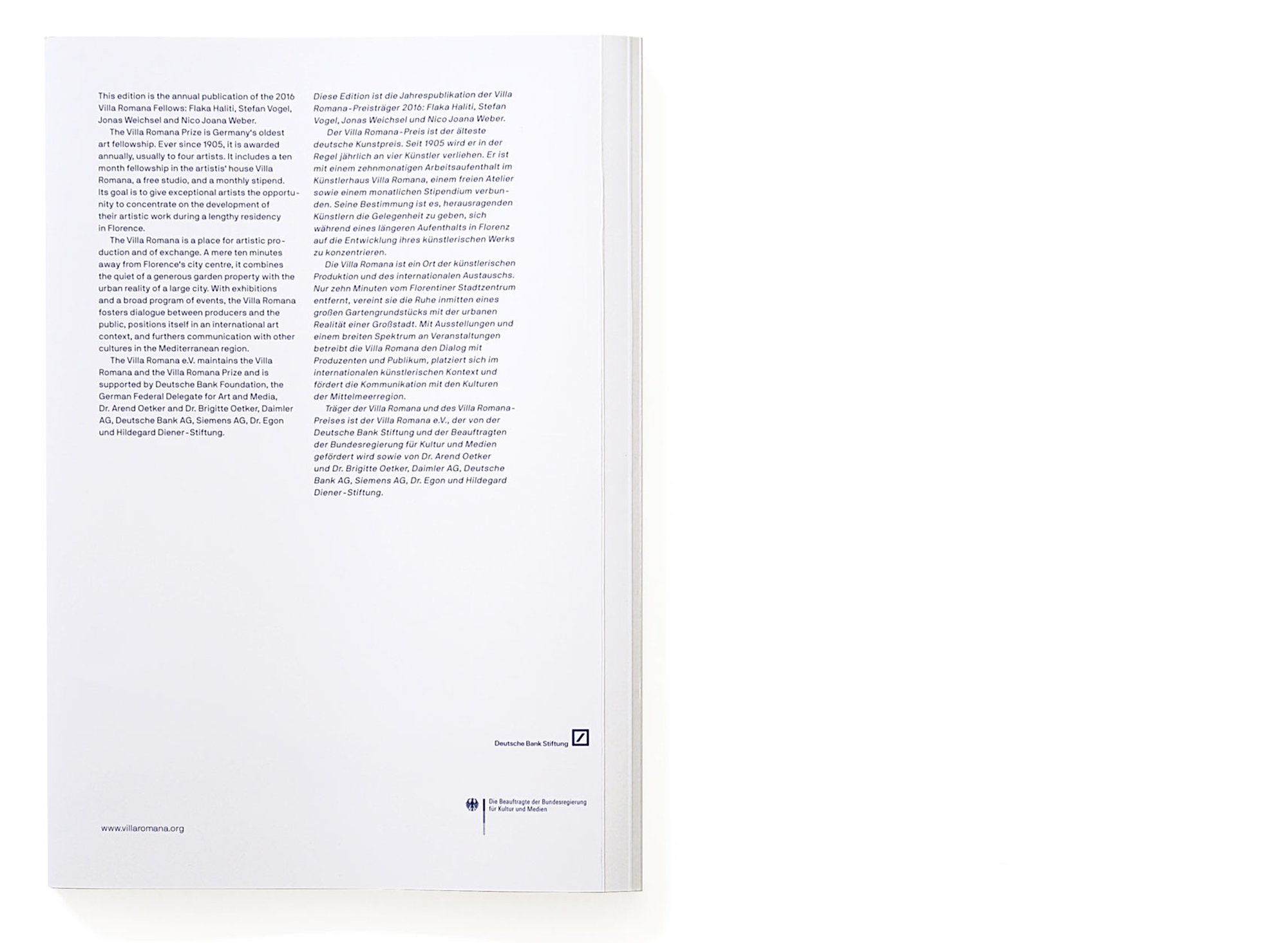 Für das Jahrbuch 2016 der Villa Romana gestalteten wir eine Softcover Broschur, in welche vier 36-Seiten Lagen eingeheftet wurden, jeweils eine für jeden der Stipendiaten dieses Jahres: Jonas Weichsel, Nico Joana Weber, Flaka Haliti und Stefan Vogel. Diese Designlösung ist das Ergebnis eines langen Dialoges zwischen Designern und Künstlern, welche durch einen Wechsel der Papiere der Identität jedes Einzelnen Raum und Ausdruck verleiht.