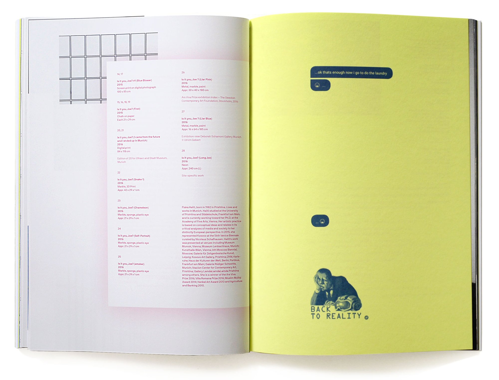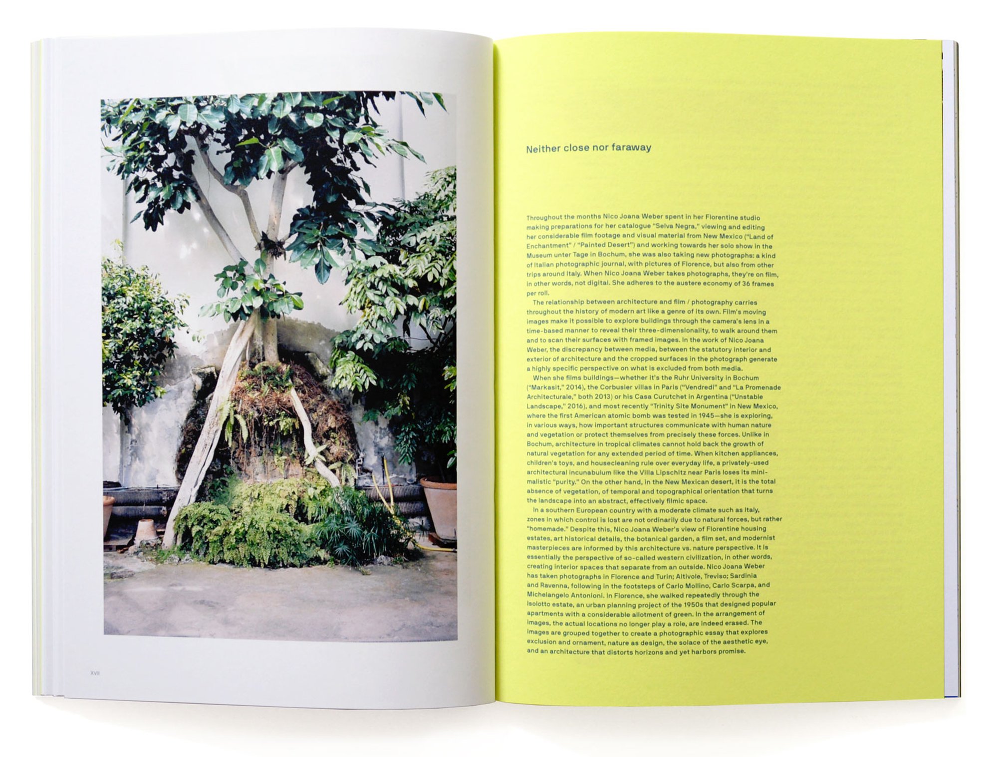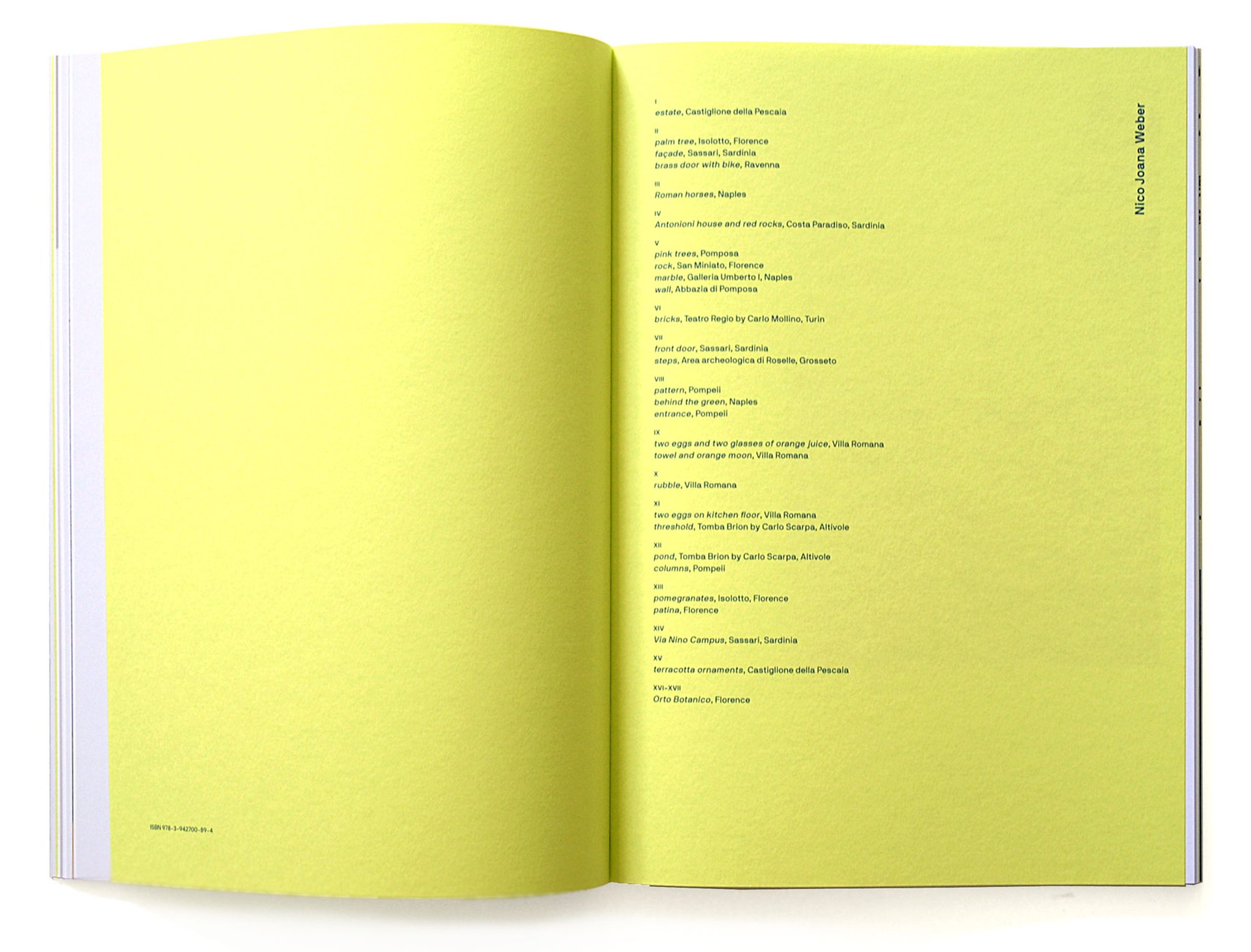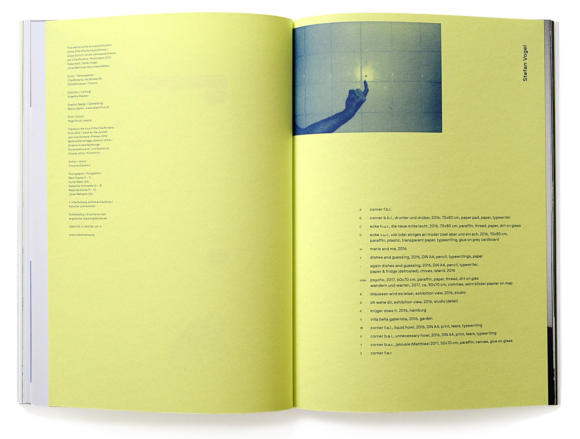 Für das Jahrbuch 2016 der Villa Romana gestalteten wir eine Softcover Broschur, in welche vier 36-Seiten Lagen eingeheftet wurden, jeweils eine für jeden der Stipendiaten dieses Jahres: Jonas Weichsel, Nico Joana Weber, Flaka Haliti und Stefan Vogel. Diese Designlösung ist das Ergebnis eines langen Dialoges zwischen Designern und Künstlern, welche durch einen Wechsel der Papiere der Identität jedes Einzelnen Raum und Ausdruck verleiht.