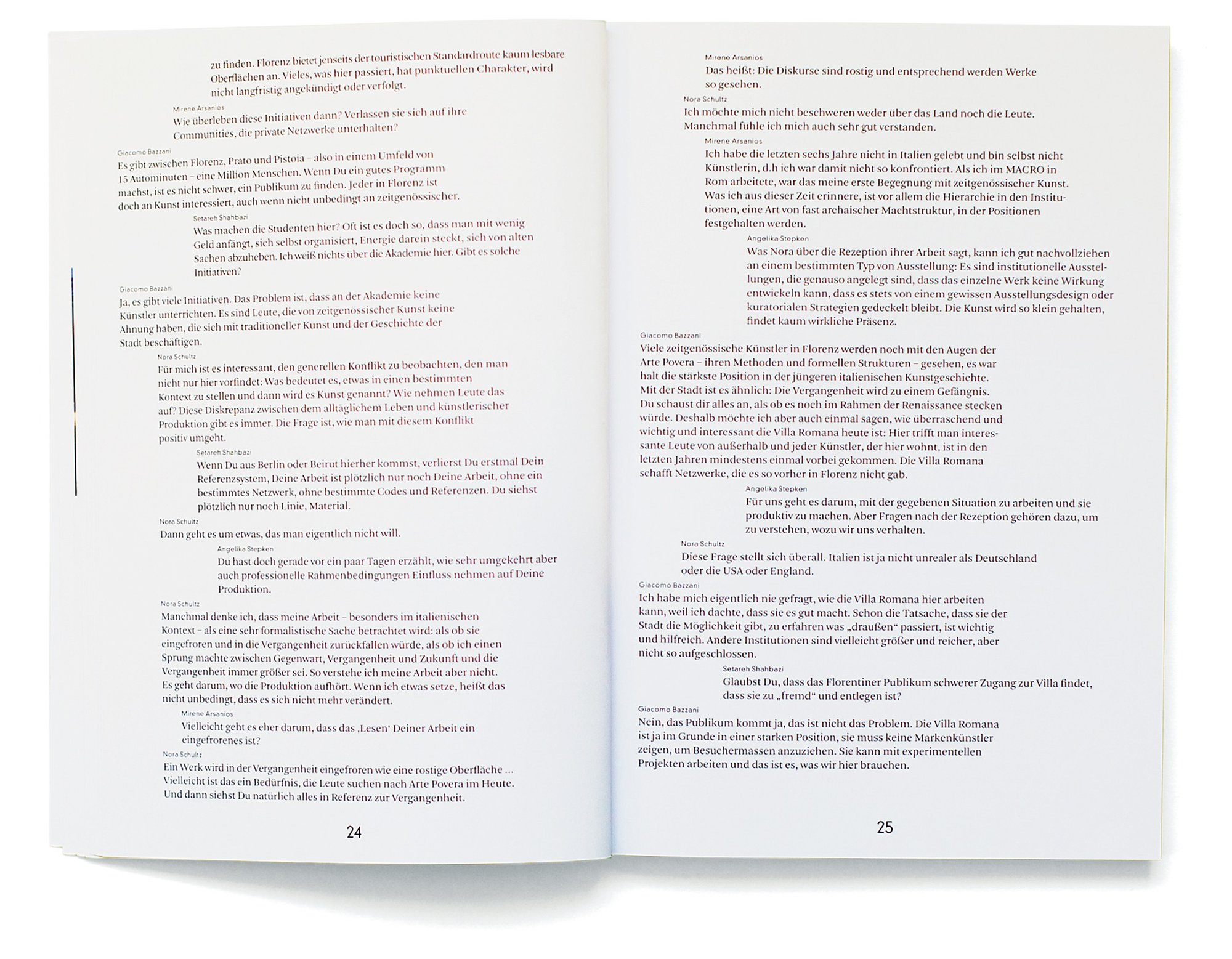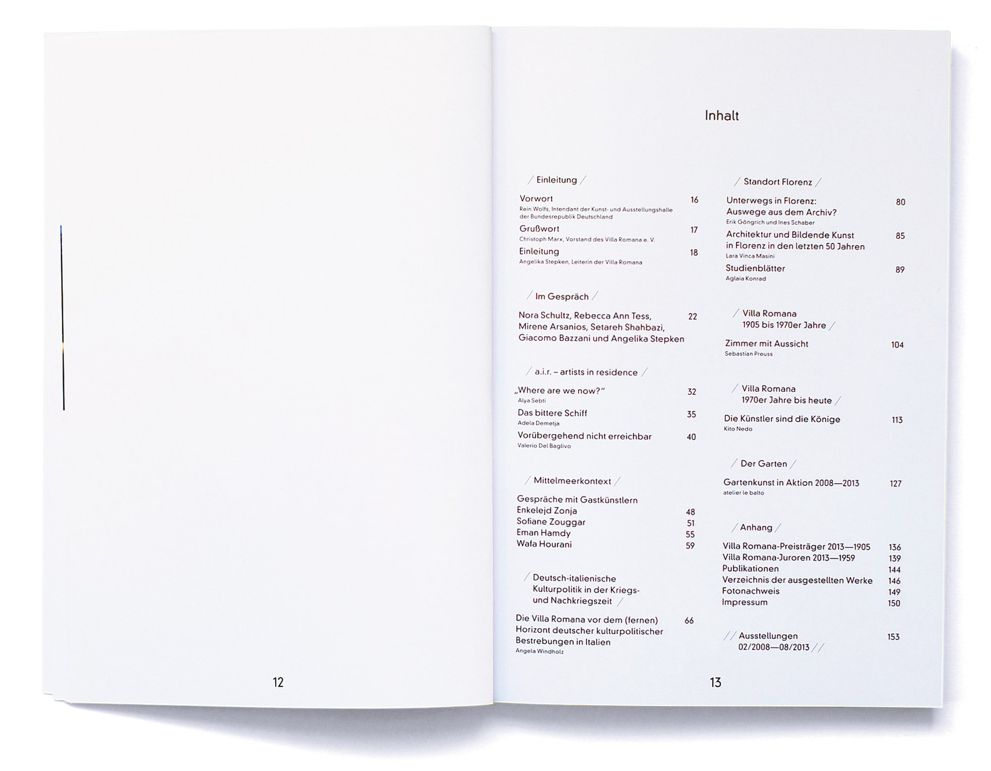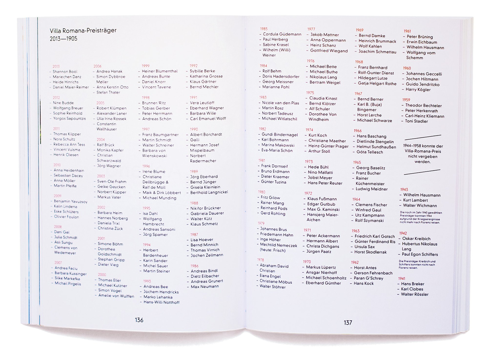 In einer großen Florenz Ausstellung in der Bundeskunsthalle Bonn stellte unser Kunde Villa Romana eine Auswahl von Arbeiten aus welche während der letzten 100 Jahre in der Villa entstanden sind. Wir wurden eingeladen, eine begleitende Publikation zu gestalten, die die Geschichte der von Deutschland betriebenen Künstlerresidenz in Florenz aus heutiger Sicht reflektiert. Um einen historischen Überblick der Künstler und Werke zu schaffen, zeigt der Umschlag über 350 Werke, die in der Villa seit ihrer Gründung im Jahr 1905 bis heute entstanden sind.