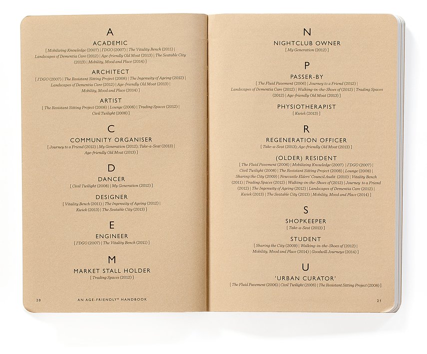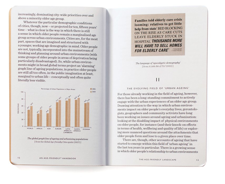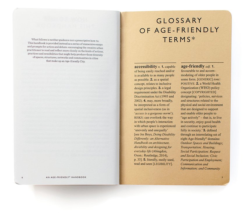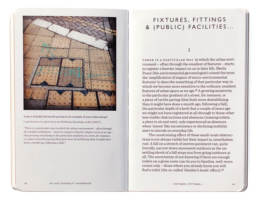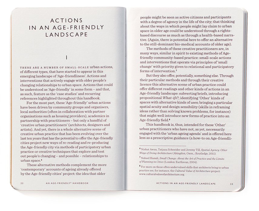 Dieses Buch der Soziologin Sophie Handler richtet sich an sozial engagierte Menschen die in den Bereichen Architektur und Stadtentwicklung beschäftigt sind. Es beleuchtet Fragen des Alterns in unseren Städten und regt Theoretiker, Designer, politische Entscheidungsträger usw. dazu an, altersbedingte Herausforderungen in ihrer Praxis zu berücksichtigen. Es wurde in enger Zusammenarbeit mit der Autorin als kleinformatiger ‘Pocket-Guide’ konzipiert.