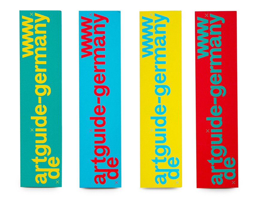 Eine Reihe von analogen ‘Bookmarks’ zur Ankündigung des artguide-germany, einer vom Institut für Auslandsbeziehungen herausgegebenen Website, die Orientierungshilfen zu Möglichkeiten der künstlerischen Ausbildung und Praxis in Deutschland bietet.