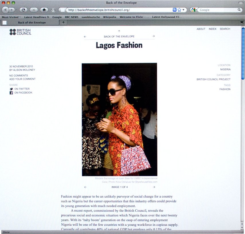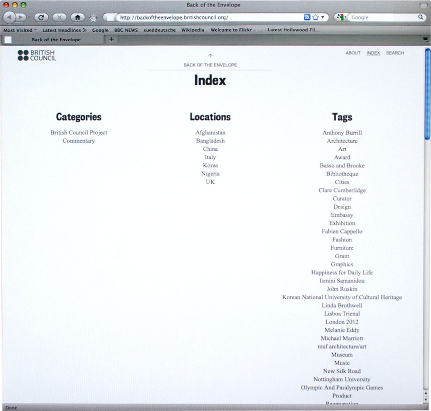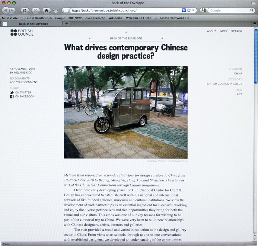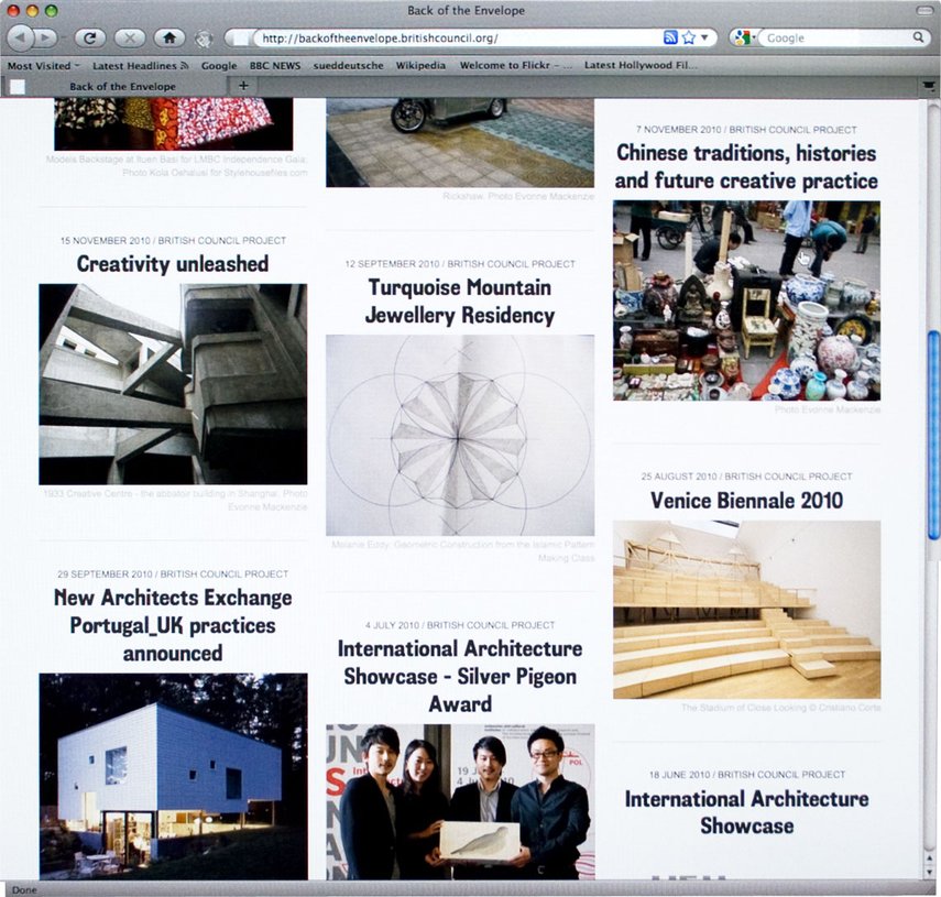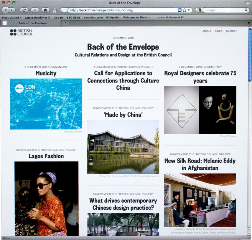 Das Team der Abteilung für Architektur, Design und Mode des British Council bat uns, einen Blog zu entwerfen, in dem sie ihre laufende Arbeit veröffentlichen und die diesen Disziplinen zugehörigen Neuigkeiten in Großbritannien kommentieren können. In Zusammenarbeit mit Wolfram Wiedner versuchten wir, die einfache Blog-Struktur in Richtung eines eher magazinorientierten Gestaltungsansatzes zu überdenken, während die einfache direktionale Navigation eines klassischen Blogs beibehalten wurde. Auch das Content Management System, wurde von neu auf gestaltet.