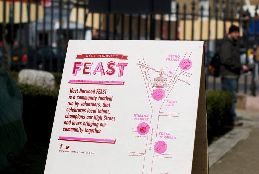 Wir sind besonders stolz darauf, dass wir für die Beschilderung und das Erscheinungsbild von FEAST ausgewählt wurden, einem lokalen Gemeinschaftsmarkt in West Norwood, London. FEAST wird vollständig von Freiwilligen betrieben und von der Greater London Authority und lokalen Unternehmen unterstützt. Der Markt findet einmal im Monat im Stadtzentrum von West Norwood statt.