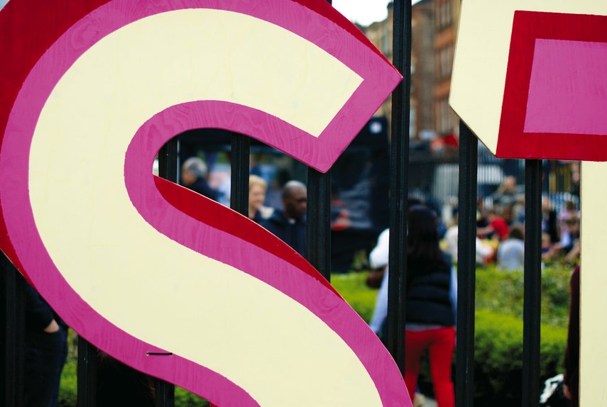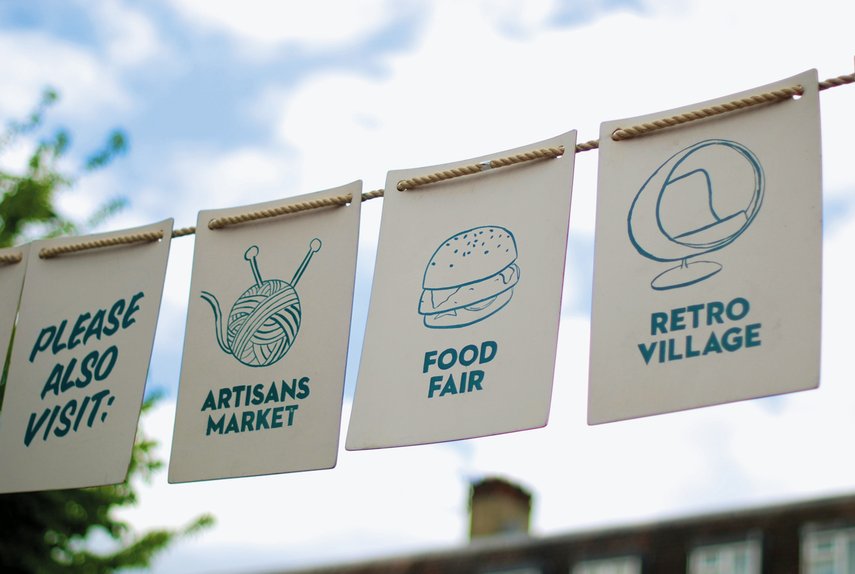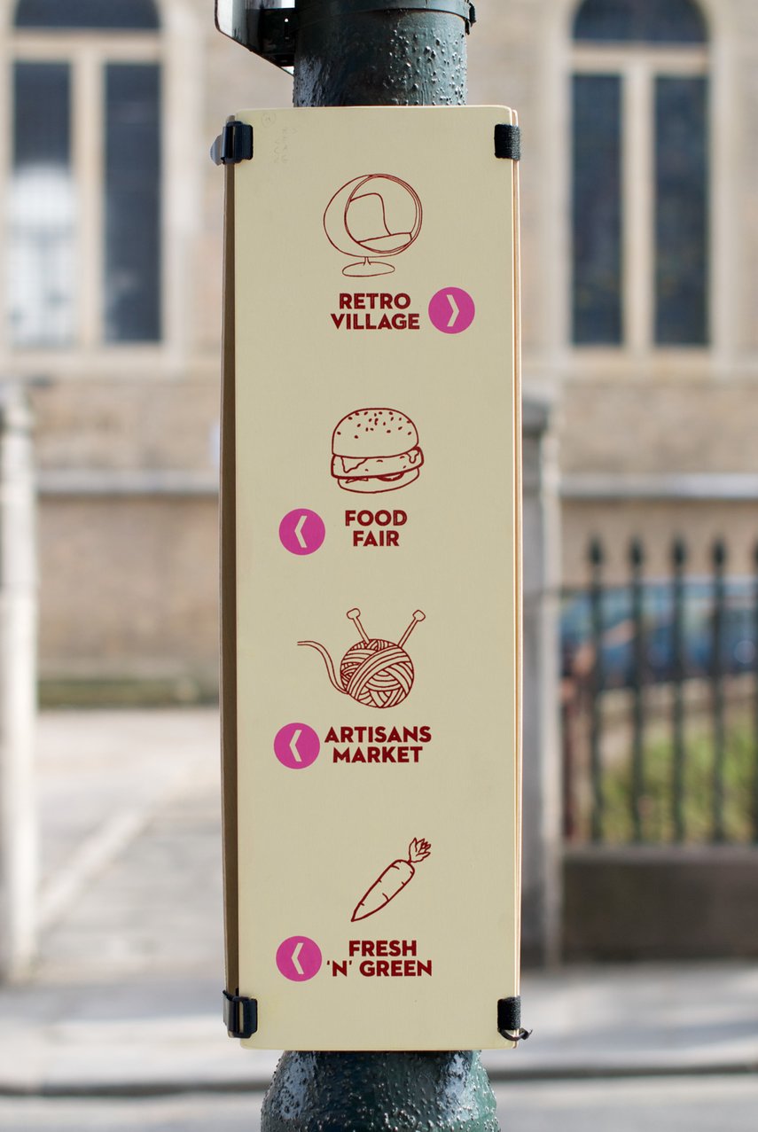 Die gestalterische Herausforderung bestand darin, das Bewusstsein für diese gemeinnützige Initiative durch Signaletik, Drucksachen und Internetauftritt zu schärfen. Die gesamte Beschilderung sollte robust und dennoch leicht sein, damit sie an Markttagen leicht von Freiwilligen aufgestellt und wieder abgebaut werden konnte. Zwei Sätze verspielter, großformatiger Buchstaben für die beiden Hauptknotenpunkte sowie hölzerne Wimpel, die über Gehwege und Geländer gespannt wurden, bilden den Kern der entwickelten Elemente. Hinzu kommen dreiseitige ‘Wraps’ die um Laternen gewickelt werden können, sowie A-Boards und Tafeln, die einige Tage vor der Veranstaltung an Knotenpunkten wie zum Beispiel dem Bahnhof angebracht werden können.