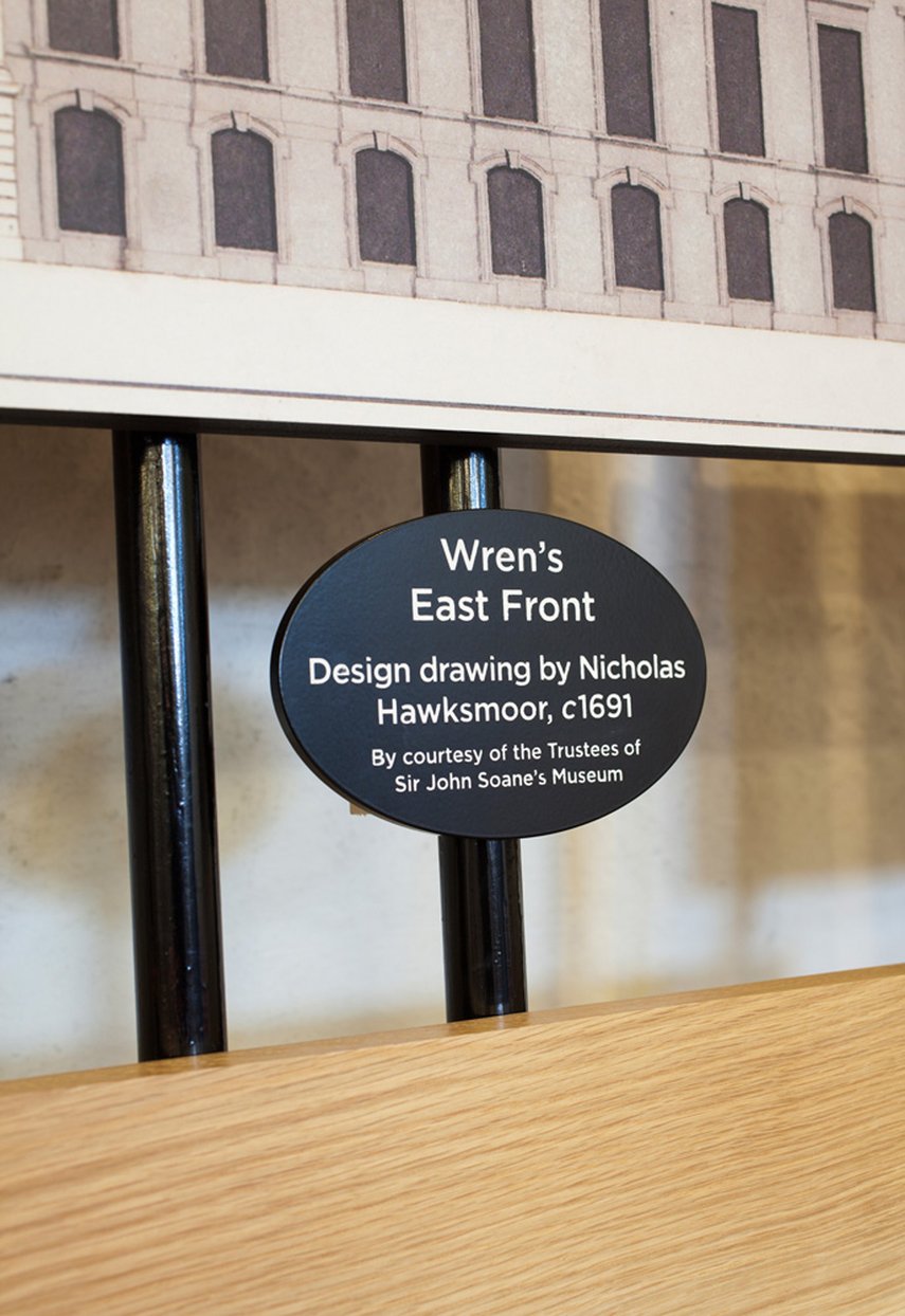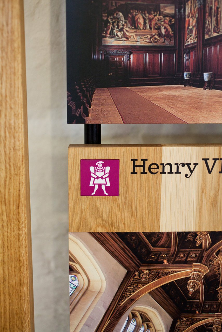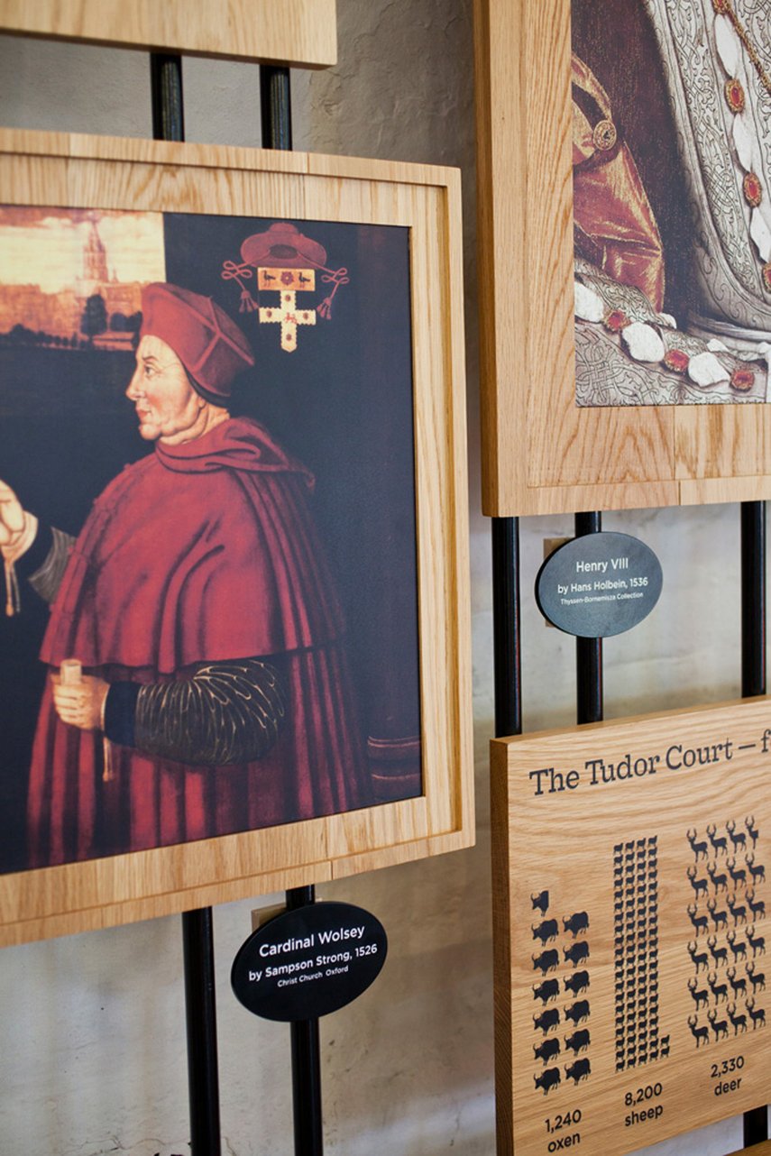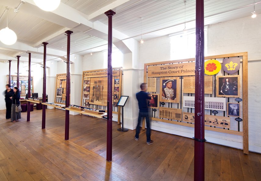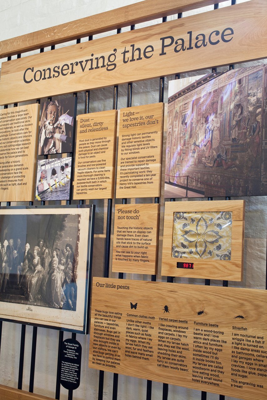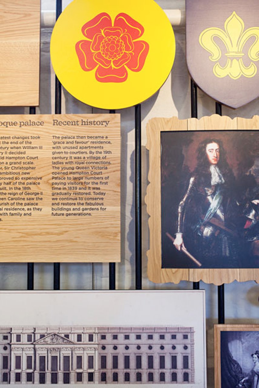 Fragmente aus 500 Jahren Geschichte des Hampton Court Palace zu präsentieren, die Arbeit des Konservierungsteams vorzustellen und einen Überblick über das Schloss zu geben – so lautete der Auftrag für die Gestaltung der Informationstafeln im Besucherzentrum des Hampton Court Palace. Um die Vielfalt der Tudor-, Barock- und viktorianischen Bewohner des Palastes widerzuspiegeln, wurden die grafischen Tafeln in verschiedenen Reproduktionsmethoden realisiert, die jeweils aus einer bestimmte Epoche stammen. Die Ausstellung besteht aus einer sorgfältigen kuratierten Anordnung einer Vielzahl von Tafeln, die von Handgezeichneten Schriften über Ferrotypie-Fotografien bis hin zum Digitaldruck reichen und auf einem Gusseisenrahmen montiert sind.
