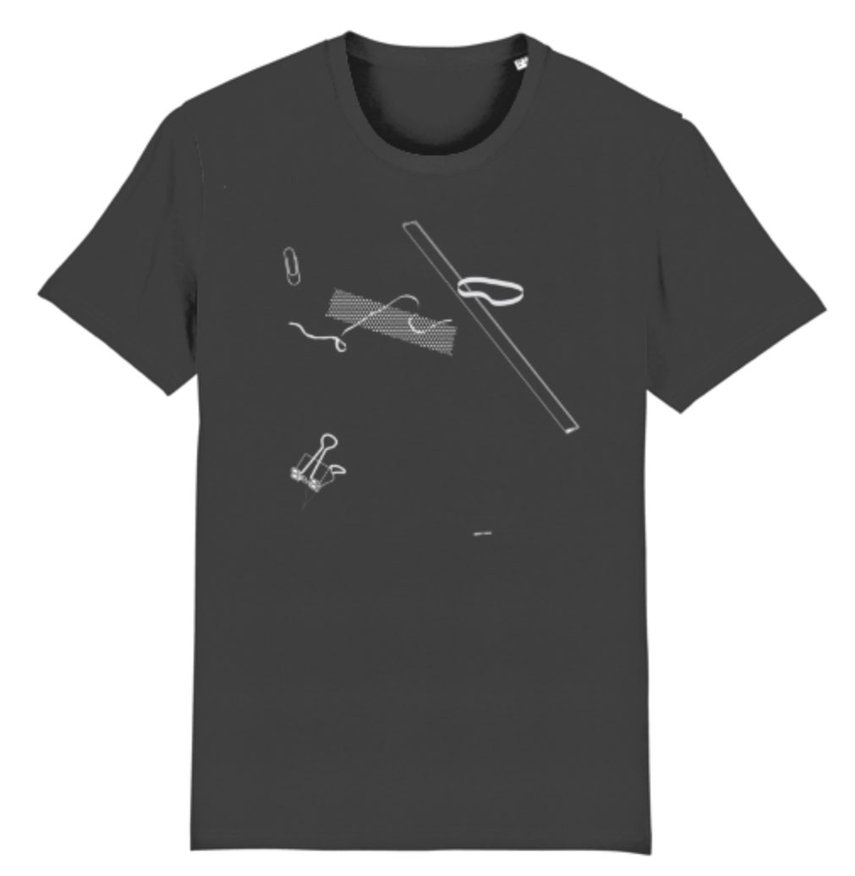 Unsere Illustration besteht aus einer Komposition aus Objekten aus unserer alltäglichen Studioumgebung, die ‘zusammen halten’. Die Illustration wurde in weiß auf einen schwarzen Stoff gedruckt.
