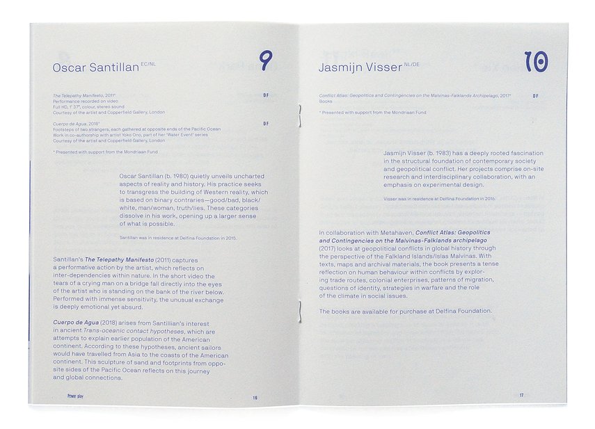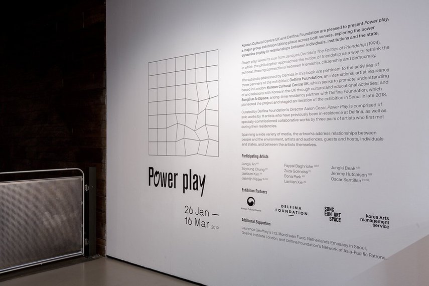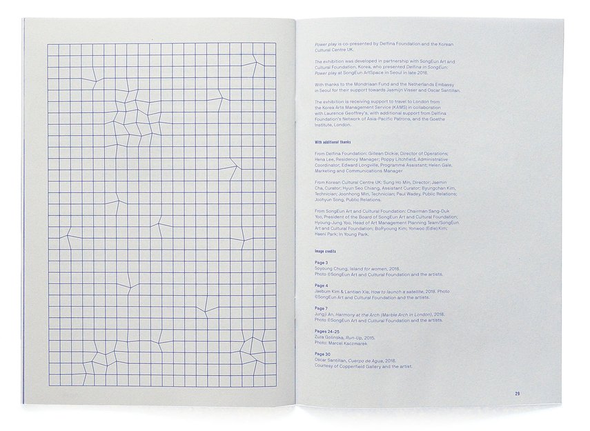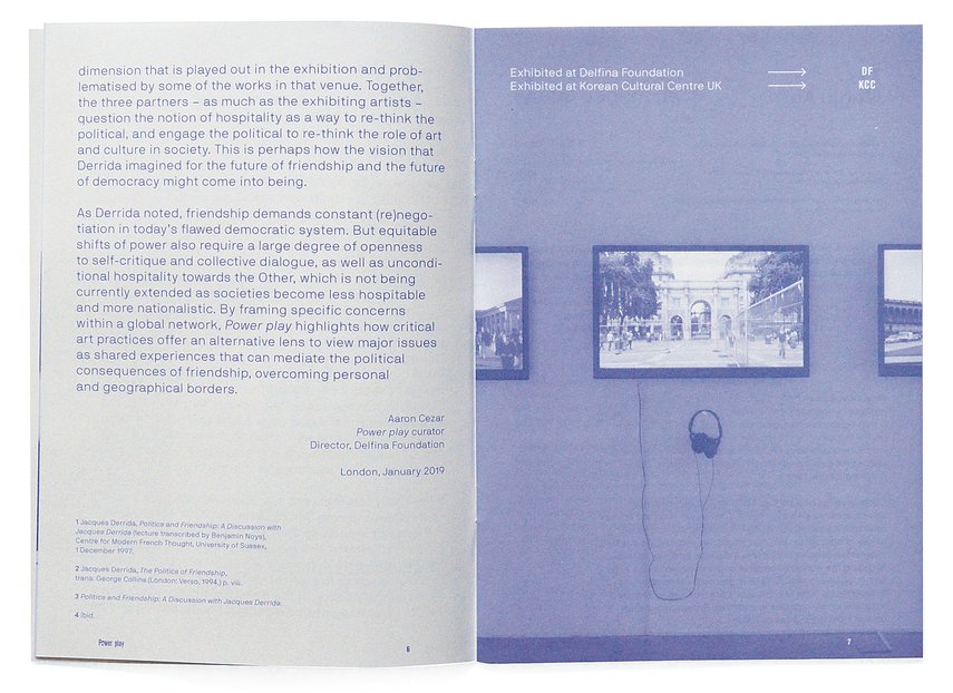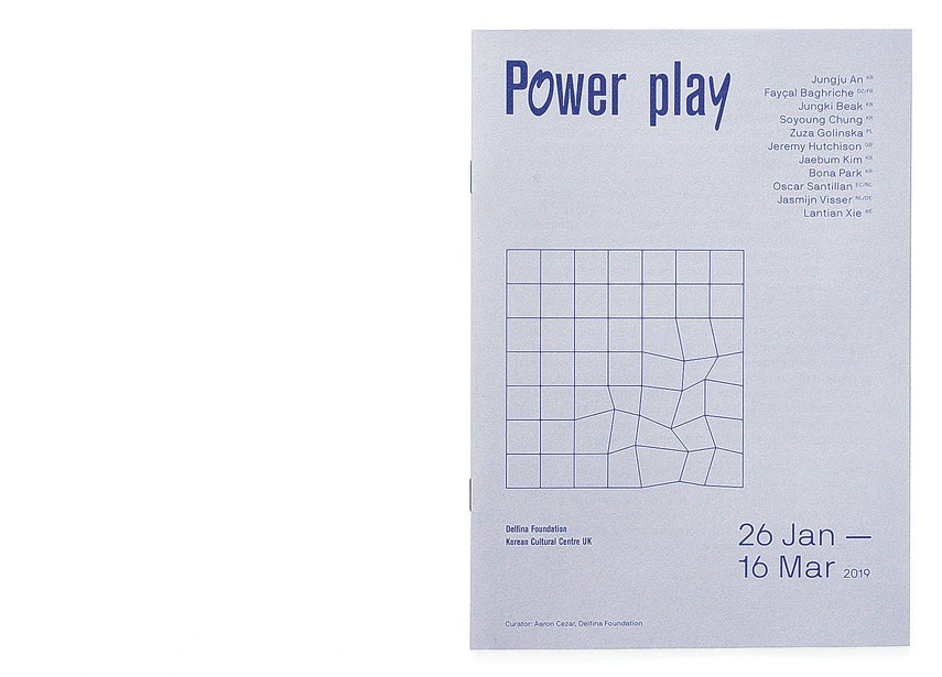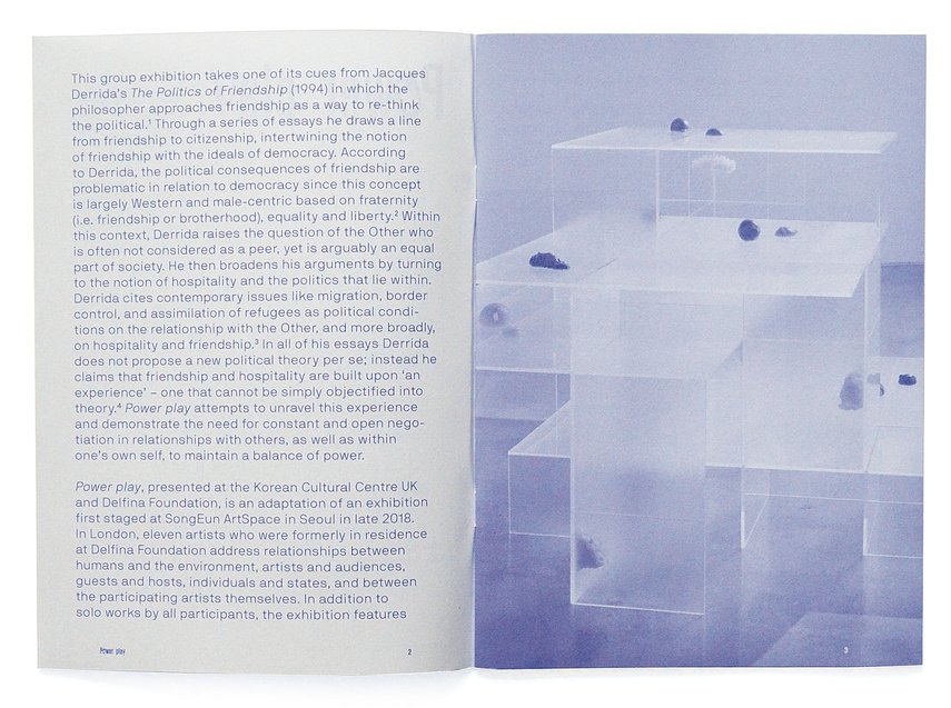 Visuelle Identität und Broschüre für Power Play, eine Gruppenausstellung organisiert von Delfina Foundation in Zusammenarbeit mit dem Korean Cultural Centre in London. Bezugnehmend auf Derrida’s Begriff der Politik der Freundschaft, zeign die Ausstellung Arbeiten von verschiedenen Künstlern die die Machtverhältnisse zwischen Indivduen, Institutionen und dem Staat erkunden.