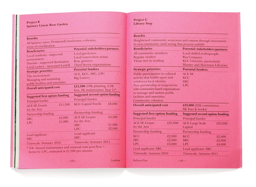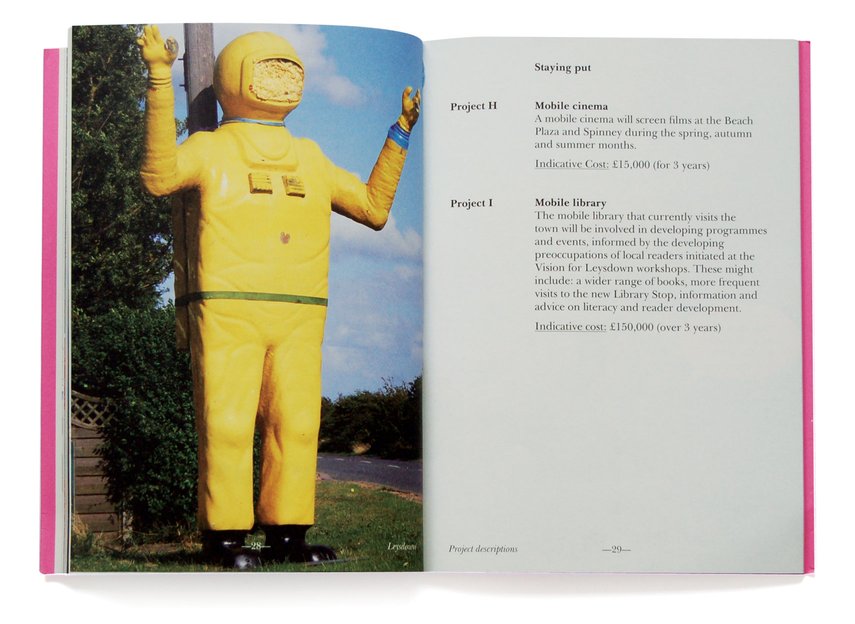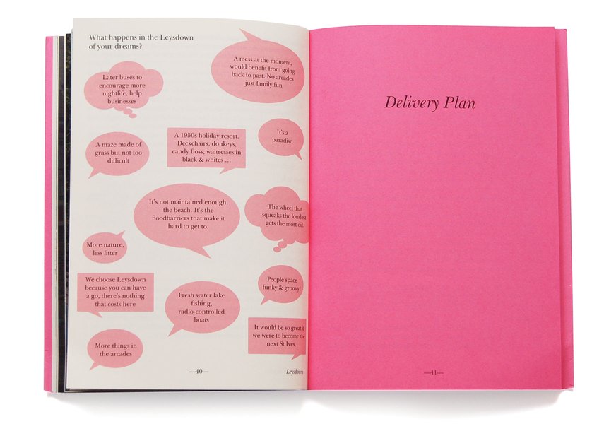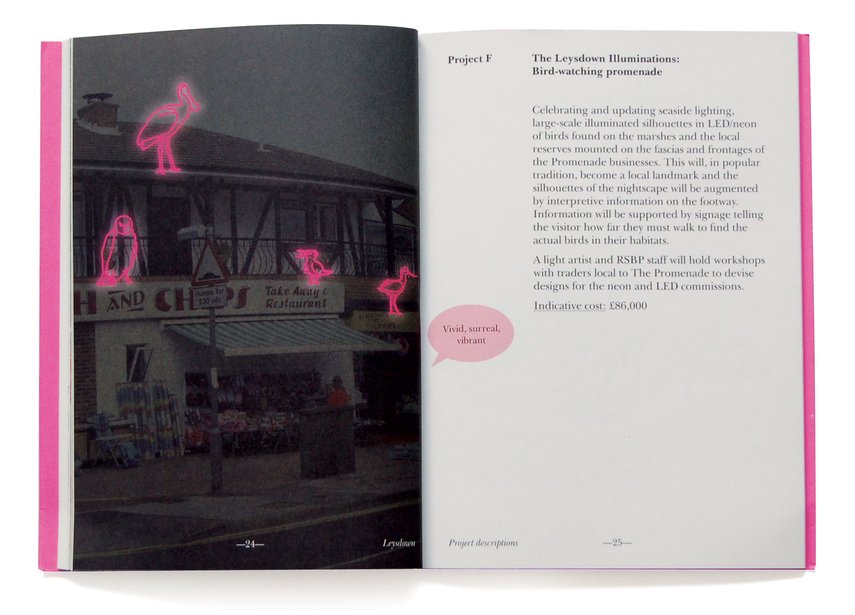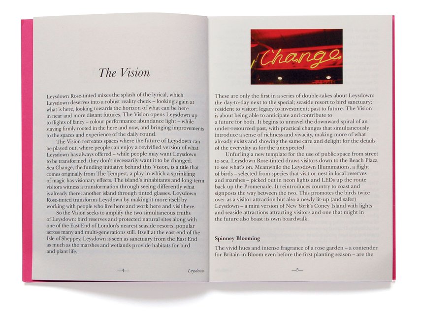 Der Swale Borough Council lud die Schriftstellerin und Künstlerin Rosa Ainley zu einem Aufenthalt in der Stadt Leysdown auf der Isle of Sheppey an der Küste von Kent ein. Ziel war es, eine künstlerische Vision für die Umgestaltung von Sheppey und insbesondere von Leysdown zu entwickeln. In enger Zusammenarbeit mit Rosa entwickelten wir eine ‘rosarote’ Publikation, die visuelle Darstellungen aller vorgeschlagenen Projekte und einen detaillierten Umsetzungsplan am Ende des Buches enthält.