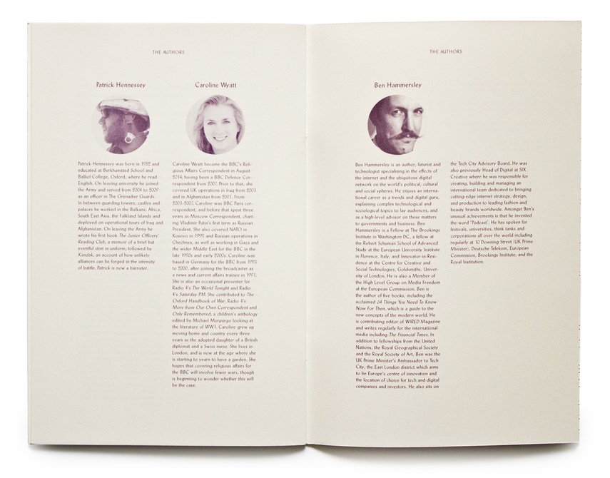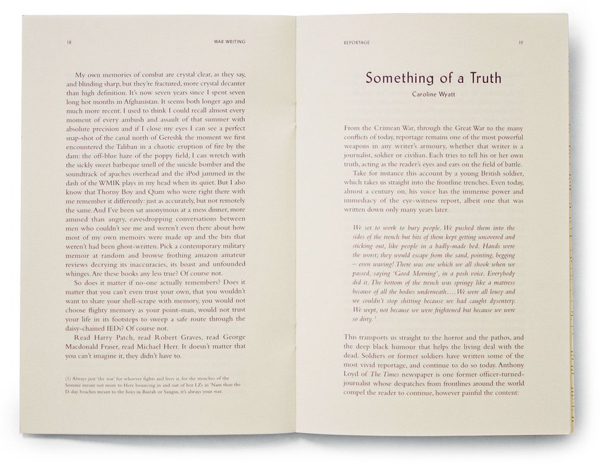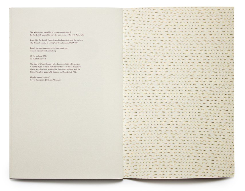 Diese kleine Publikation enthält fünf Essays zum Thema ‘Kriegskorrespondenz’. Der British Council wählte jeweils einen Beitrag von prominenten britischen Gegenwartsautoren aus den Genres Belletristik, Lyrik, Reportage, Memoiren und Blogging zur Veröffentlichung aus.