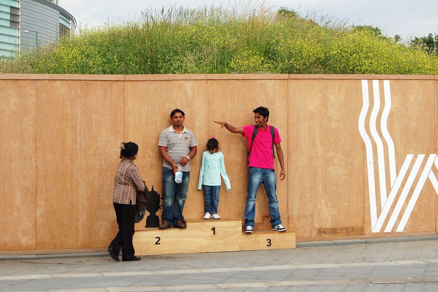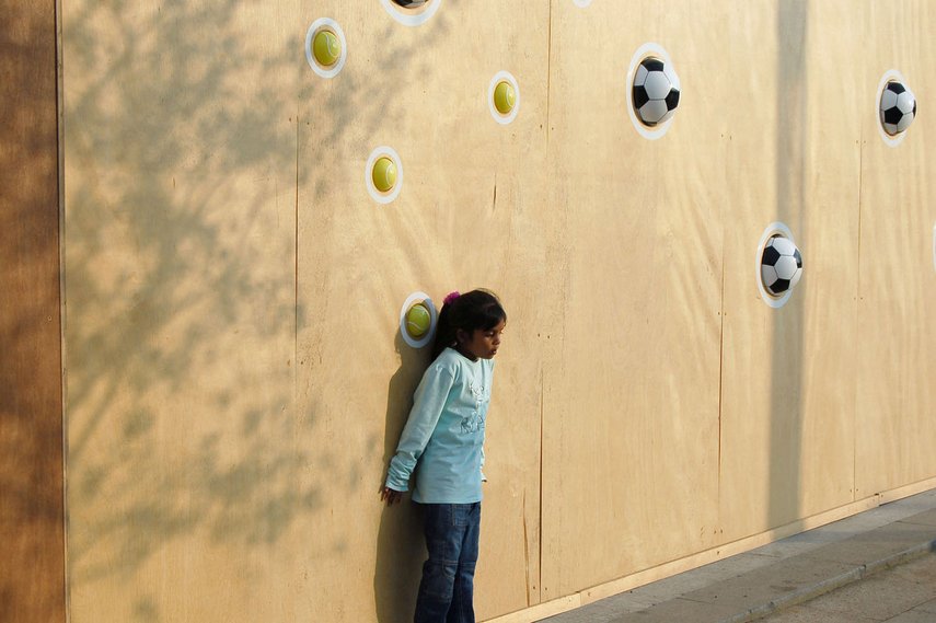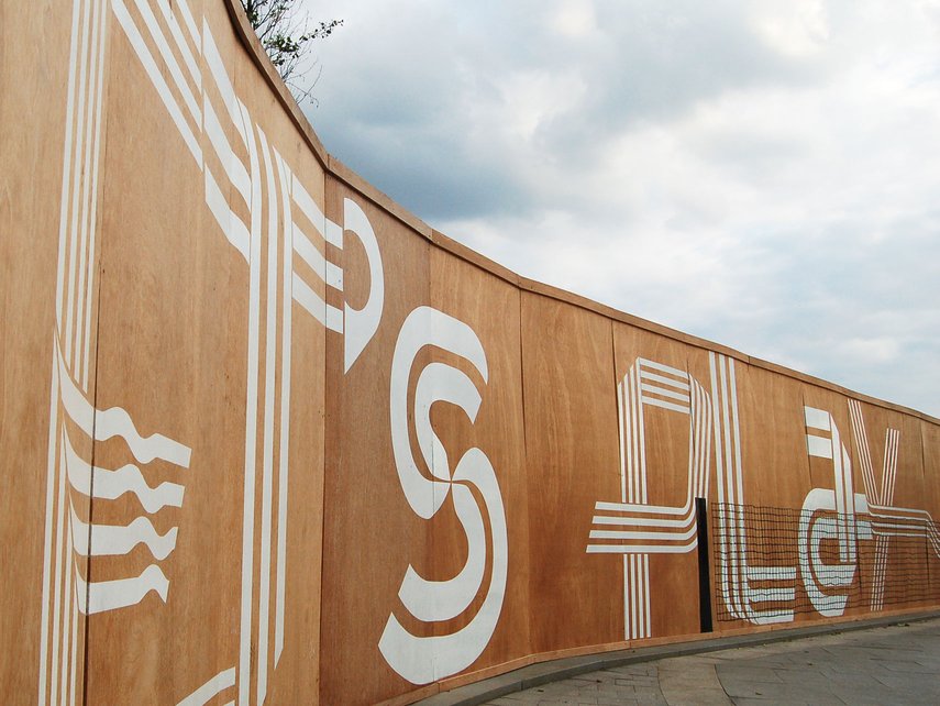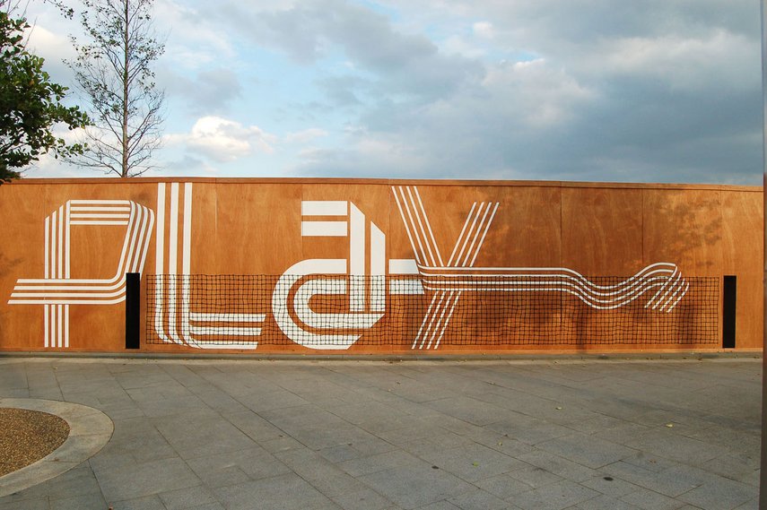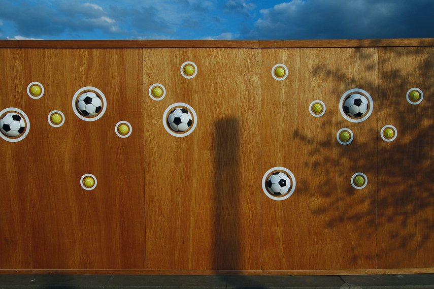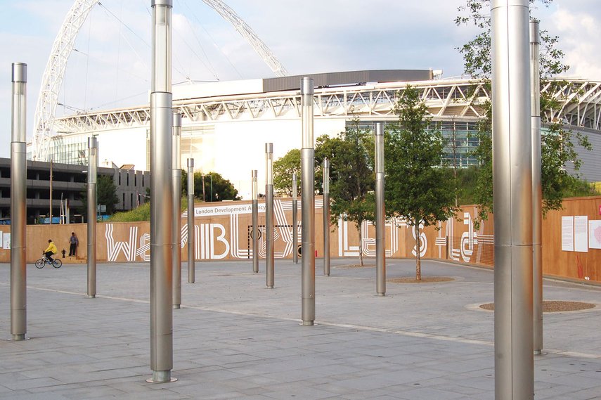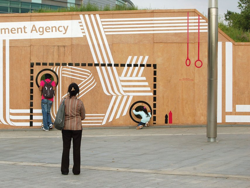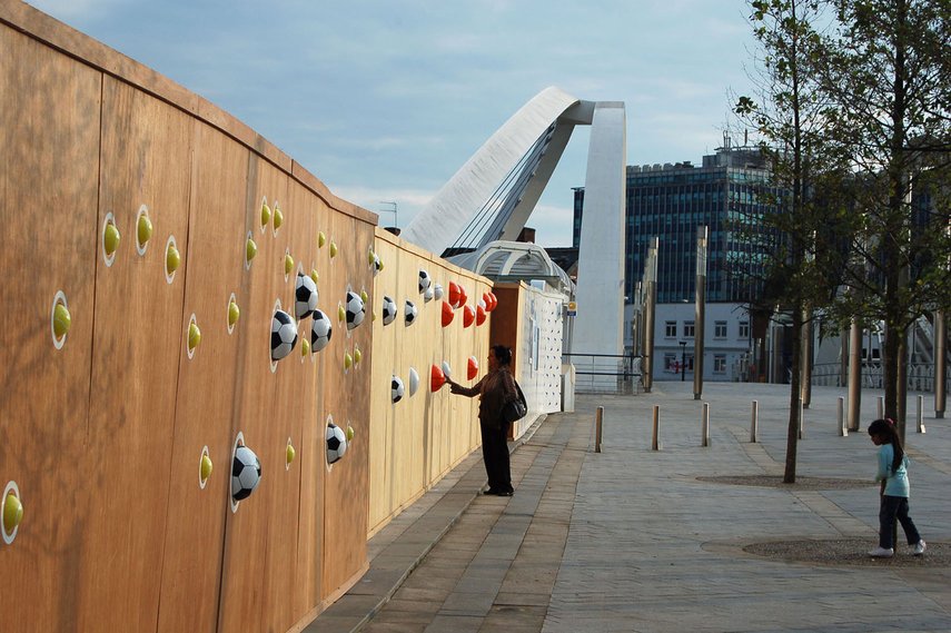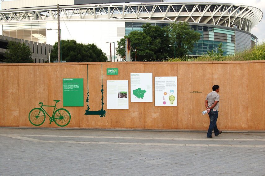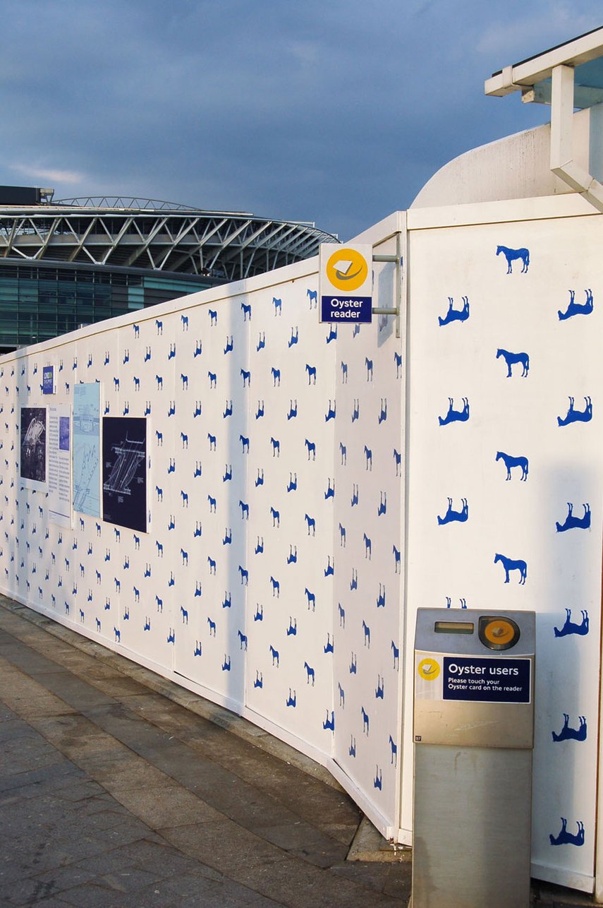 Ein 120 Meter langer Bauzaun in der Nähe des Wembley-Stadions wurde ausgewählt, um die laufenden Arbeiten der London Development Agency zur Verbesserung des öffentlichen Raums in London zu bewerben. Wir wurden beauftragt, ein grafisches Konzept zu entwickeln, das sowohl die örtlichen Anwohner einbezieht als auch das Ziel der LDA, nachhaltige architektonische Entwicklung im Großraum London zu unterstützen, visuell umsetzt. Die Nähe zum Wembley-Stadion inspirierte uns zu dem Konzept, eine überdimensionale Wand zum Thema Sport zu gestalten. Sie besteht aus drei Abschnitten: Informationen über die kürzlich fertiggestellte ‘White Horse Bridge’, eine Promenade aus beleuchteten kugelförmigen Plexiglasbällen und eine ‘Torschusswand’, die Kinder dazu anregt, sie als Spielfläche zu nutzen.